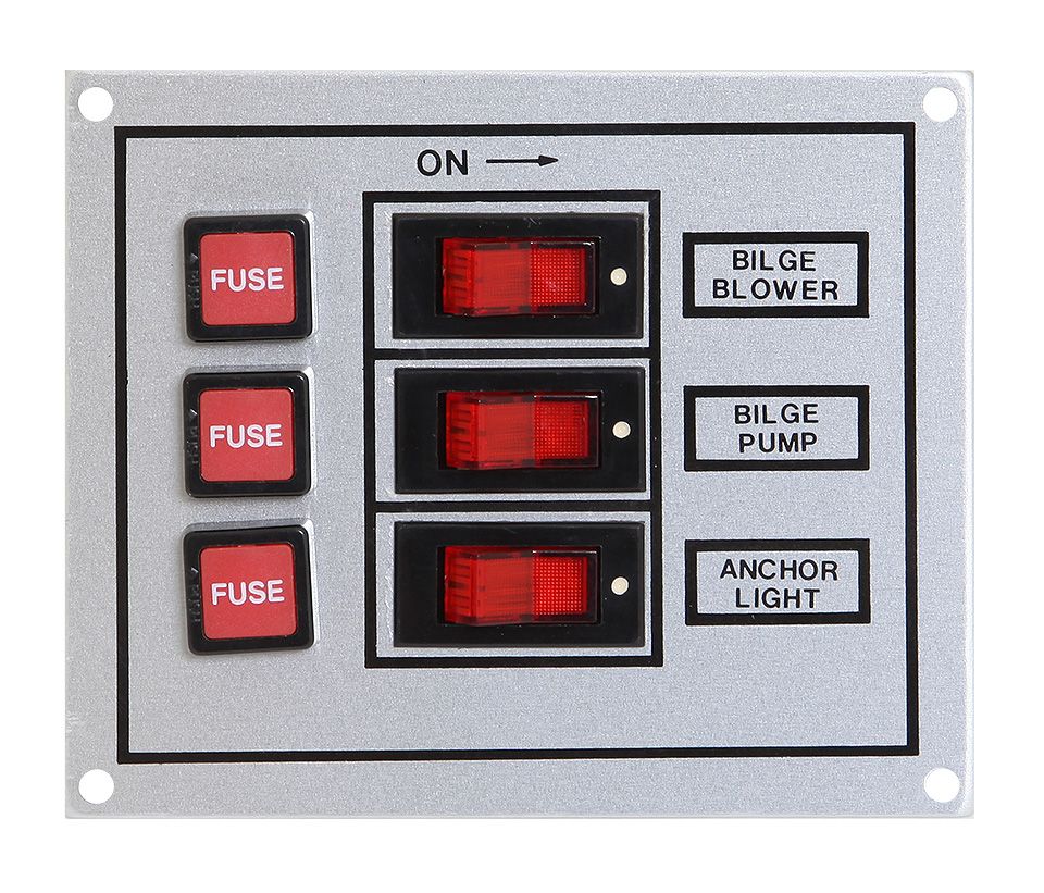 Панель выключателей с предохранителями, 3 клавиши, белая (10235922). Алюминиевая панель с четырьмя крепежными отверстиями по периметру. 3 плавких предохранителя. 3 клавишных выключателя с подсветкой и табличками: "anchor light" (стояночный огонь), "running light" (ходовые огни), "cabin light" (освещение рубки).Напряжение питания: 12 В.