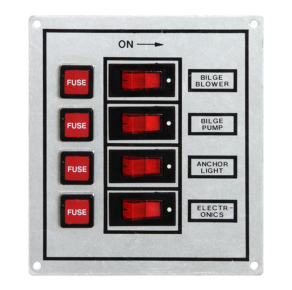 Панель выключателей с предохранителями, 4 клавиши, белая (10235923). Алюминиевая панель с четырьмя крепежными отверстиями по периметру. 4 плавких предохранителя. 4 клавишных выключателя с подсветкой и табличками: "anchor light" (стояночный огонь), "running light" (ходовые огни), "cabin light" (освещение рубки), "bilge pump" (трюмная помпа).