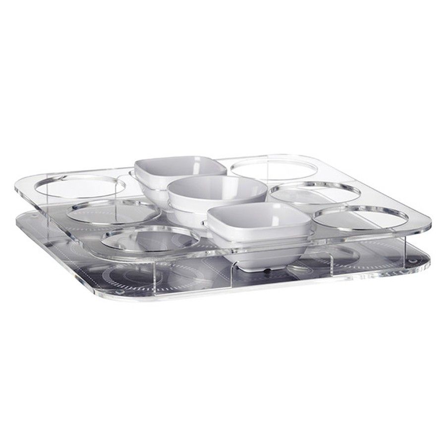 Подставка для закусок и напитков "Party" (10265063). Подставка из поликарбоната с шестью гнездами под миски или стаканы + три миски в комплекте. В наборе 4 предмета. Цена за набор.Размер: 34х34 см