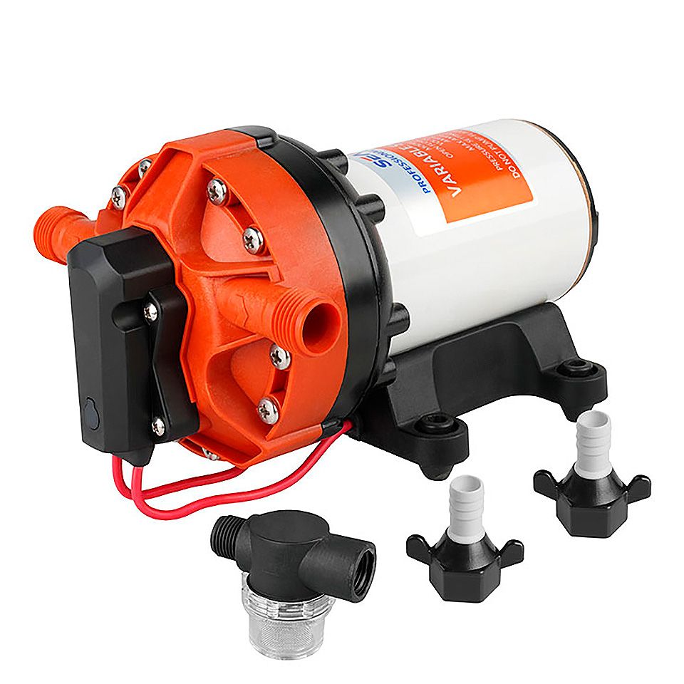 Помпа для подачи воды с переменой производительностью SeaFlo, 18,9 л/мин, 12 В (10270440 ). Автоматическая нагнетательная помпа с переменной производительностью. Автоматически меняет скорось вращения двигателя в зависимости от количества потребляемой воды. Не нуждается в напорном баке. Отличается тихой работой. Не повреждается при работе в отсутствии воды. Высота самовсасывания: 1,8 м.Напряжение питания: 12 В.Максимальное давление: 4,8 Бар.Максимальный потребляемый ток: 10 А.Производитель: SeaFlo, Китай.