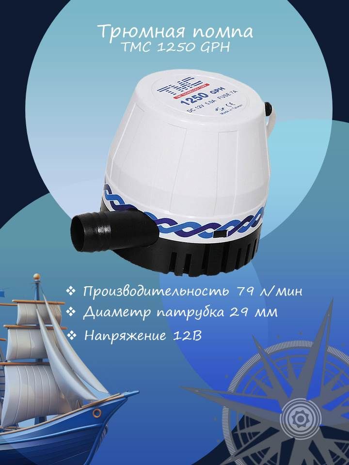 Трюмная помпа "TMC 1250", 12 В (10016215). Электрическая трюмная помпа производительностью 79 л/мин. Применяется для откачки трюмной и подсланевой воды. Включается по мере необходимости владельцем судна или по мере поступления воды автоматическим выключателем (приобретается отдельно).