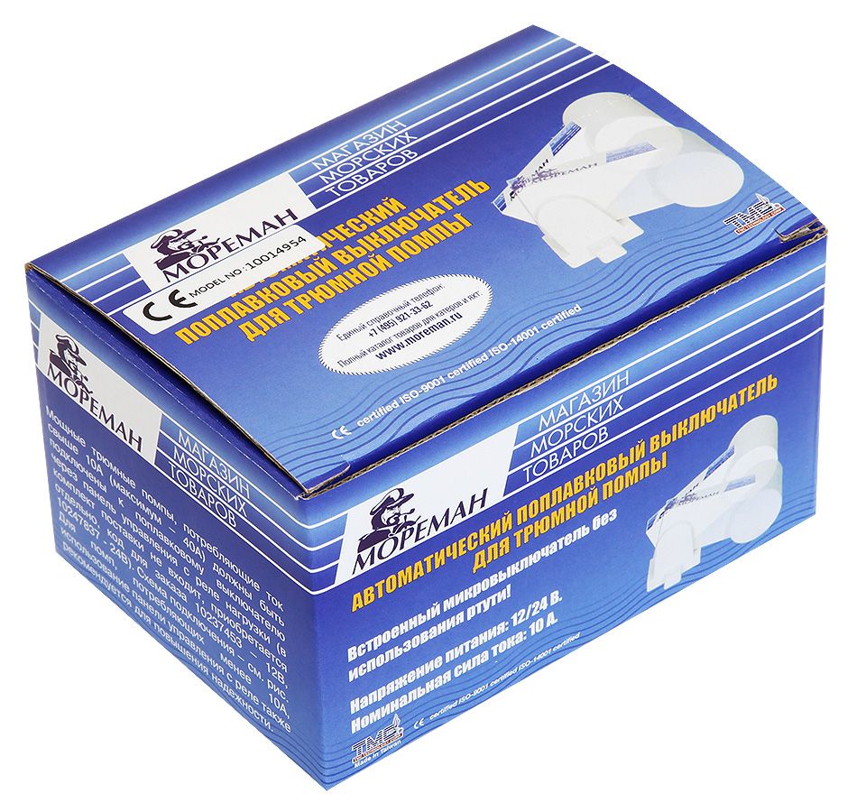 Поплавковый выключатель для трюмных помп, "ТМС" (10014954). Поплавковый выключатель для управления работой трюмной помпы и(или) включения аварийной сигнализации. Обеспечивает автоматическое включение и выключение трюмной помпы, аварийной сигнализации или того и другого одновременно в зависимости от уровня воды в месте установки выключателя. Используется со всеми видами трюмных помп. Используя несколько выключателей, установленных на разных уровнях, можно создавать автоматические осушительные системы из нескольких помп (к примеру, из основной и резервной, включающейся, если не справляется основная). Один выключатель может управлять работой нескольких соединенных параллельно помп (суммарный ток не должен превышать указанное номинальное значение). Выключатель изготовлен из коррозионно-стойких материалов и имеет взрывозащищенную конструкцию.
