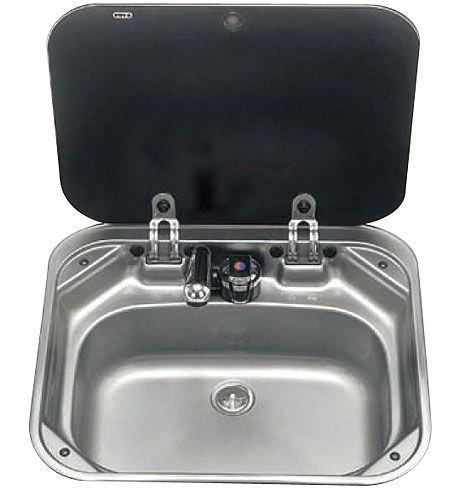 Раковина со смесителем и крышкой, прямоугольная (10086139). Раковина из нержавеющей стали. Укомплектована складным краном, смесителем и крышкой.