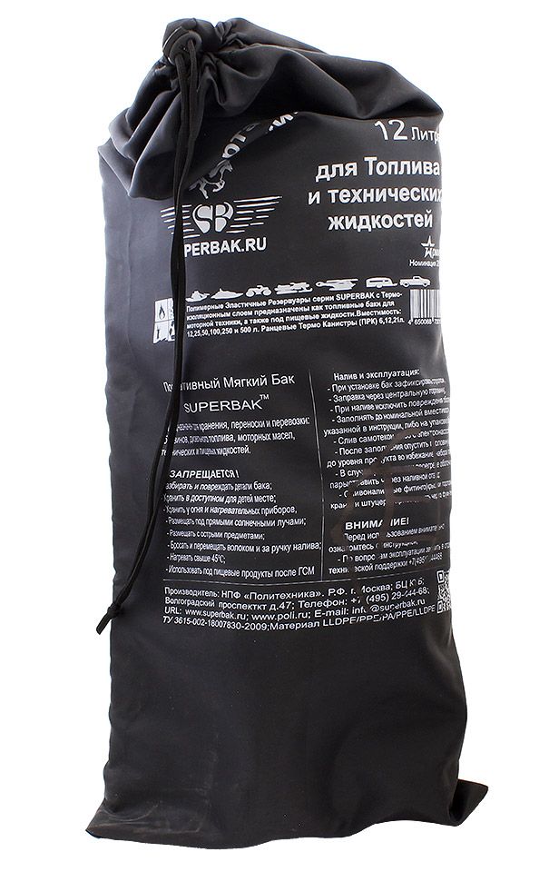 Компактная и легкая мягкая канистра-бак для хранения и переноски топлива или воды. Состоит из внутренней герметичной полимерной емкости, теплоизоляционного материала марки Пенофол и внешней силовой тканевой оболочки. Имеет стропы для переноски за спиной. Присоединив систему слива к нижнему отводу, канистра становится полноценным топливным баком.