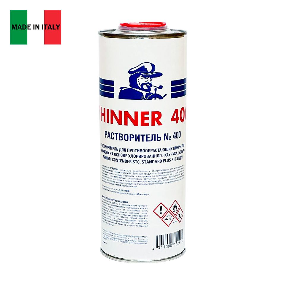 Растворитель для нанесения кистью противообрастающих красок Мореман Thinner 400, 1 л (10270553 ). Растворитель Мореман 400 (Thinner 400) применяется для разбавления необрастающих красок Contender STC и Standard Plus STC. Указания по применению смотрите в инструкциях на соответствующие лакокрасочные материалы!Объём: 1 л. Произведен в Италии специально для ООО "Мореман"