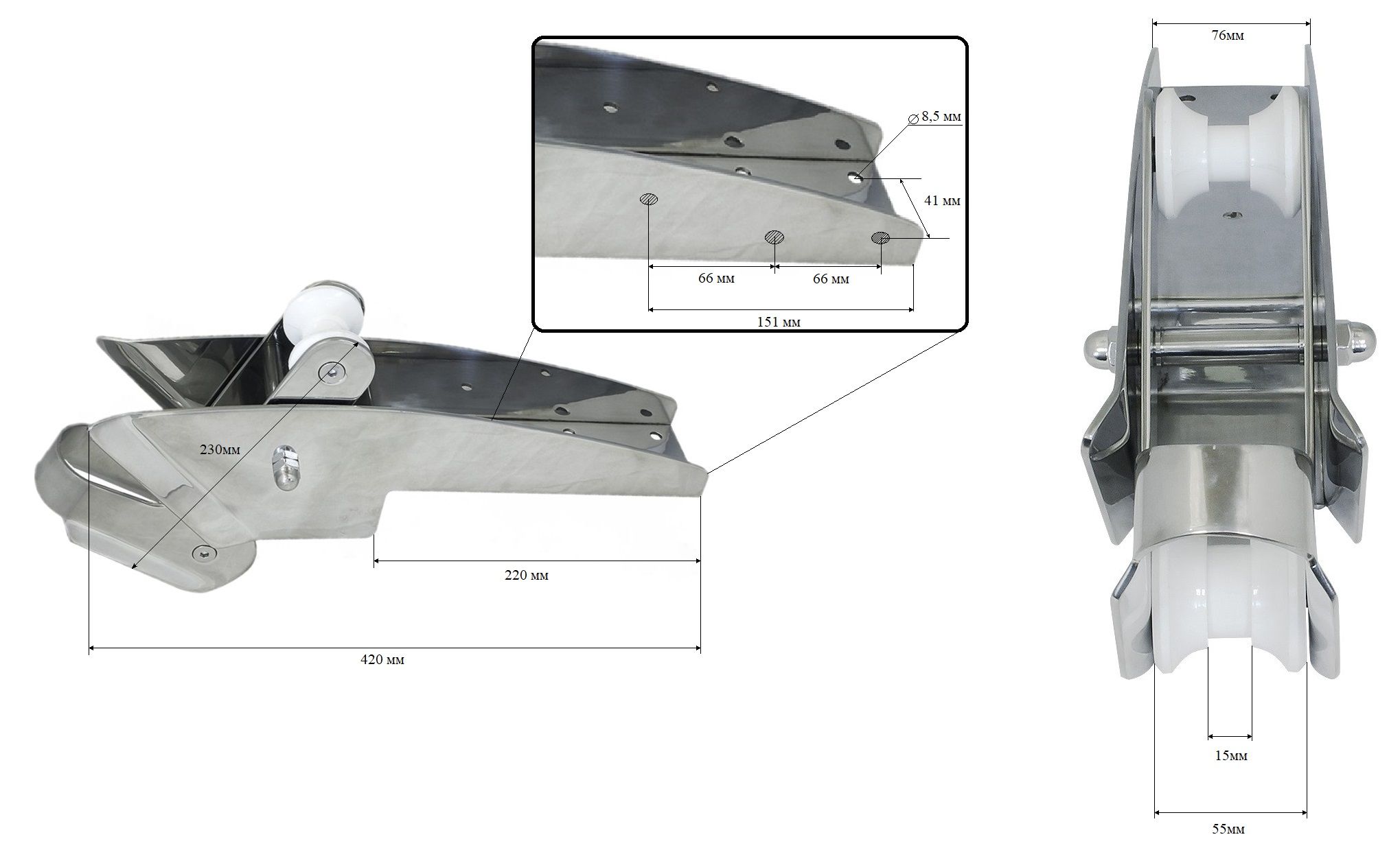 Роульс, 420 мм (10245084). Роульс из полированной 5-миллиметровой нержавеющей стали. Снабжен коромыслом, облегчающим спуск и подъем якоря. Пригоден для всех типов безштоковых якорей весом 7,5-15 кг. Длина: 420 мм. Ширина: 76 мм. Высота: 110 мм.Толщина стали: 3,5 мм.Вес: 3,4 кг. Производитель: Китай