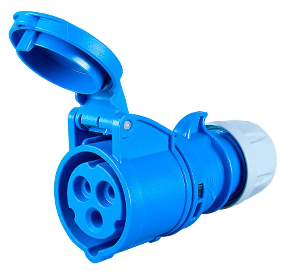 Розетка брызгозащищенная (10260036). Брызгозащищенная по стандарту IP44 розетка. 3 контакта цилиндрической формы. Для монтажа на кабель.
