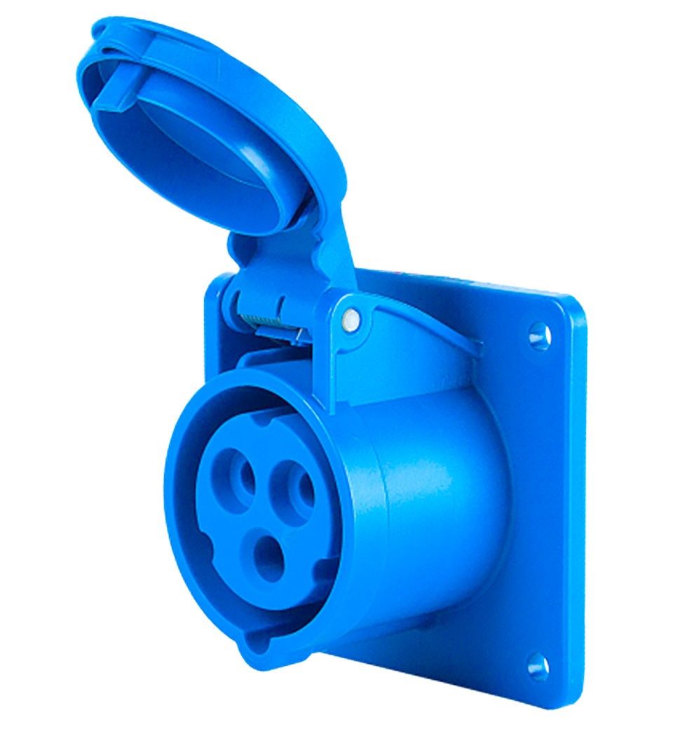 Розетка брызгозащищенная, врезаемая (10260040). Брызгозащищенная по стандарту IP44 розетка. 3 контакта цилиндрической формы. Врезаемая в плоскость конструкция.
