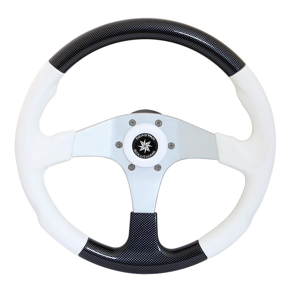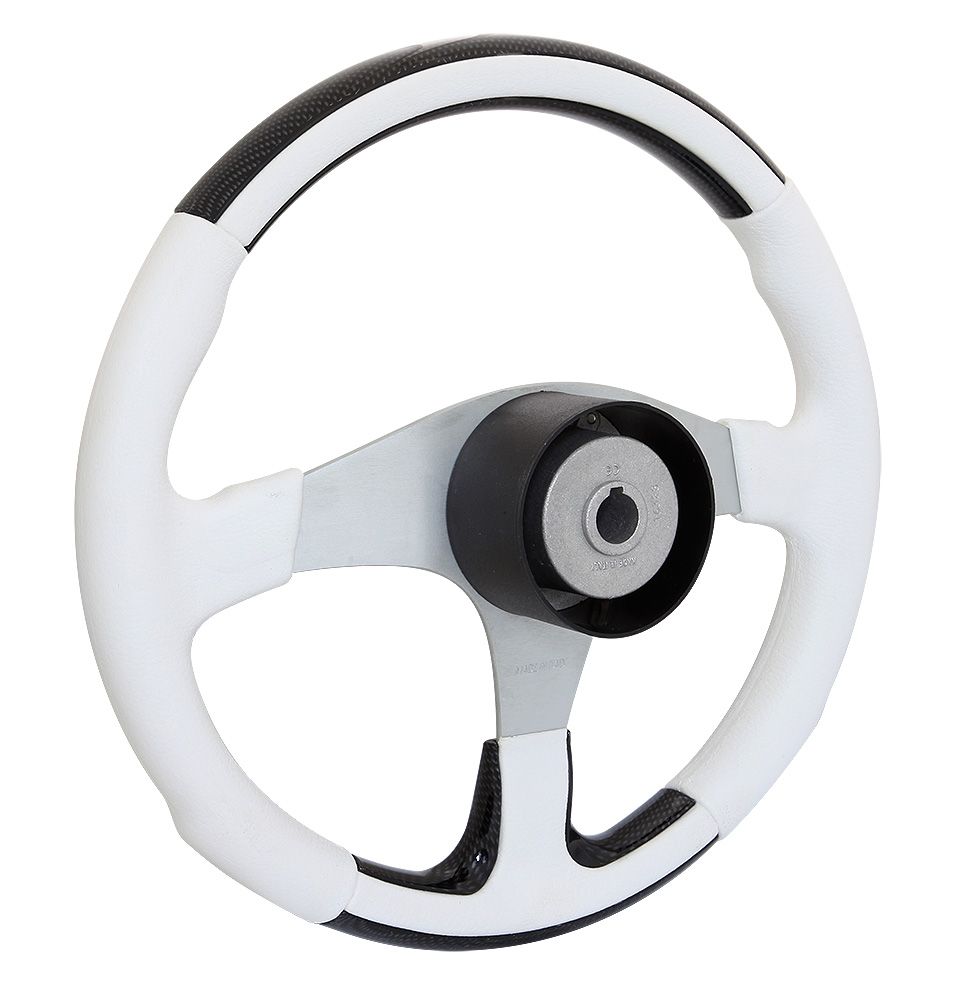 Рулевое колесо "Evolution", белый обод с карбоновыми вставками. (10016468). Рулевое колесо со ступицей из легкого сплава и утолщенным ободом диаметром 355 мм с серебристыми, карбоновыми, вересковыми и синими вставками. Ступица круглой формы имеет посадочный конус стандартного размера.Вес - 1,900кг.Цвет спиц: серебристый.Цвет обода: черный, белый.Производитель: "SeaStarSolutions" (ранее "Teleflex"), США.