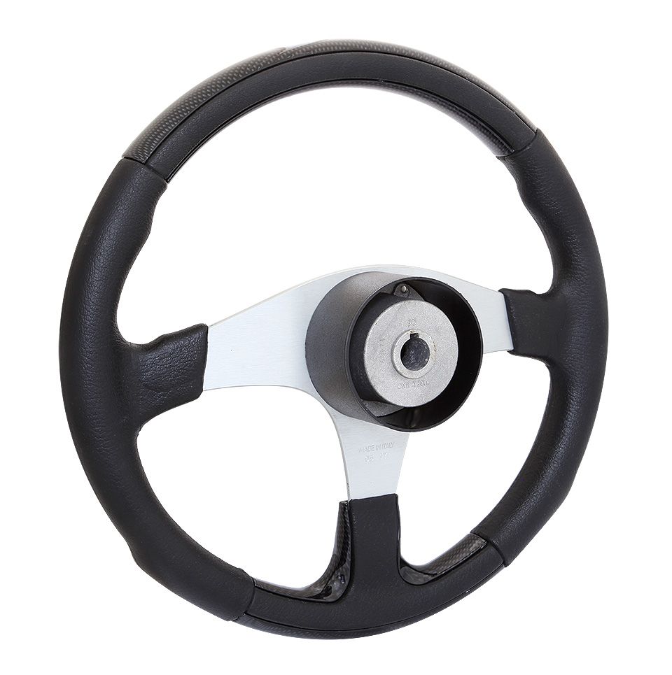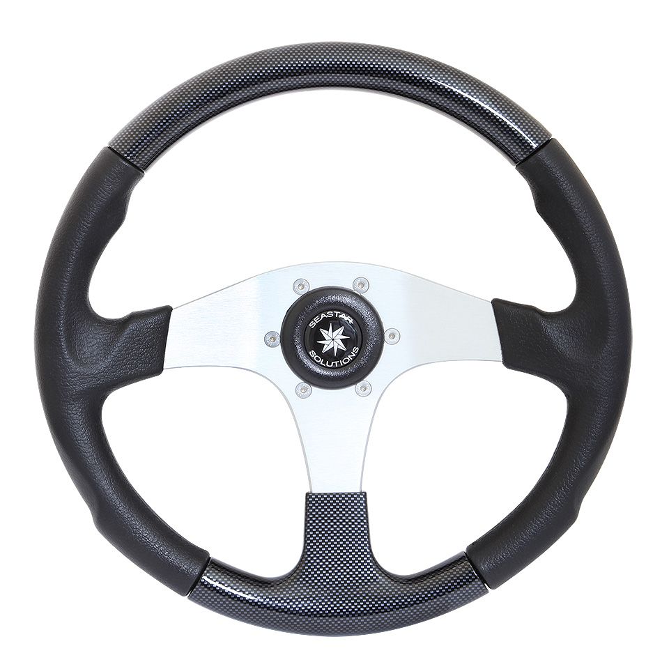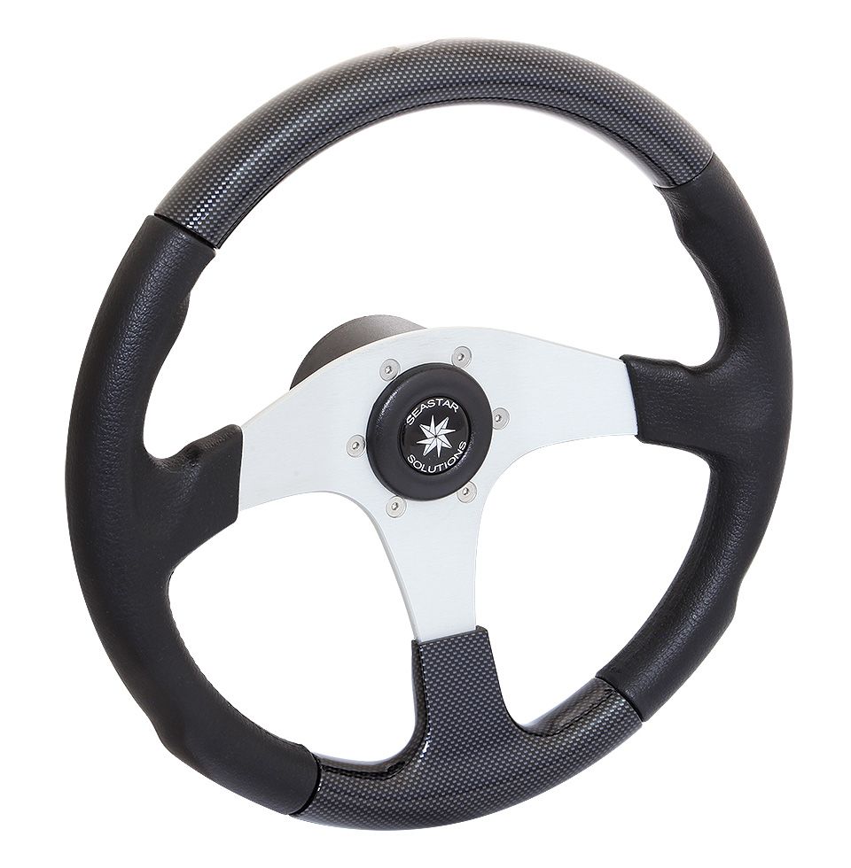 Рулевое колесо "Evolution", черный обод с карбоновыми вставками. (10016465). Рулевое колесо со ступицей из легкого сплава и утолщенным ободом диаметром 355 мм с серебристыми, карбоновыми, вересковыми и синими вставками. Ступица круглой формы имеет посадочный конус стандартного размера.Вес - 1,900кг.Цвет спиц: серебристый.Цвет обода: черный, белый.Производитель: "SeaStarSolutions" (ранее "Teleflex"), США.