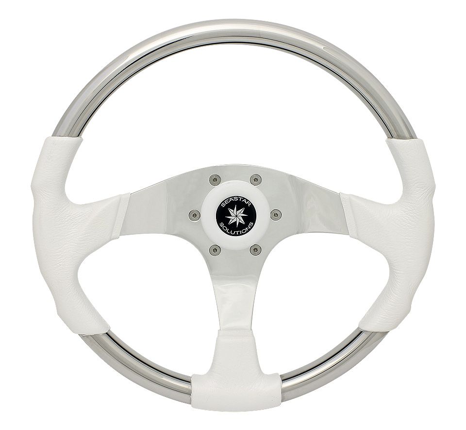 Рулевое колесо "Matrix", белый обод. (10016474). Рулевое колесо с полированными нержавеющими ободом и спицами. Обод диаметром 350мм снабжен мягкими полиуретановыми накладками. Ступица круглой формы имеет посадочный конус стандартного размера.Вес - 1,900кг.Цвет обода: черный, белый.Производитель: "SeaStarSolutions" (ранее "Teleflex"), США.