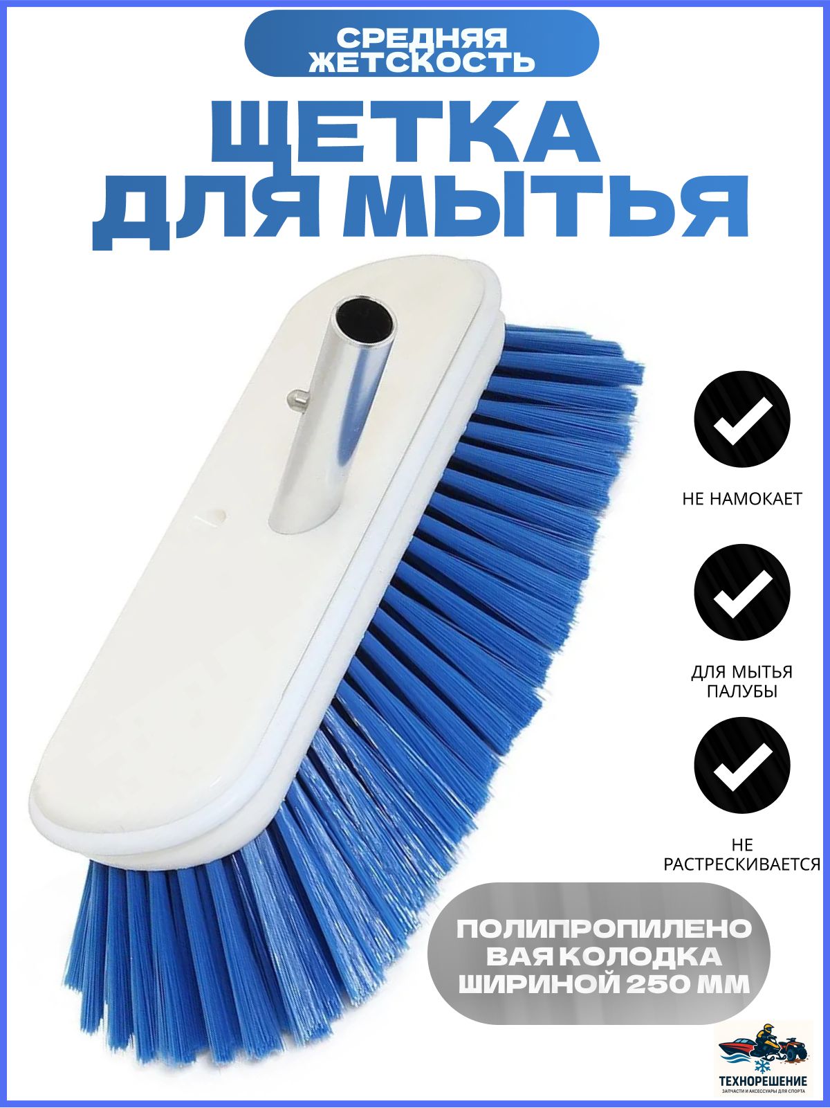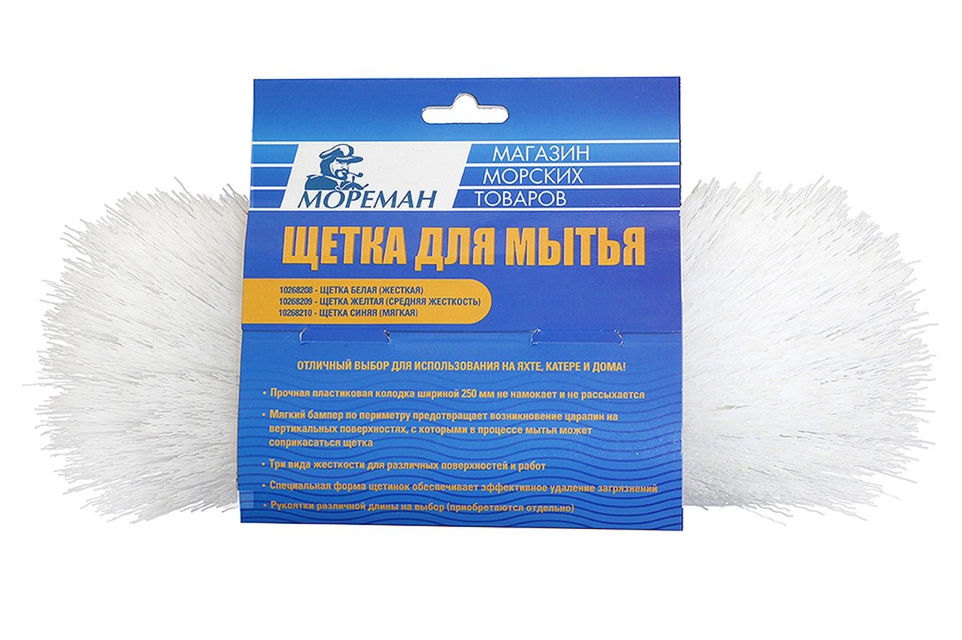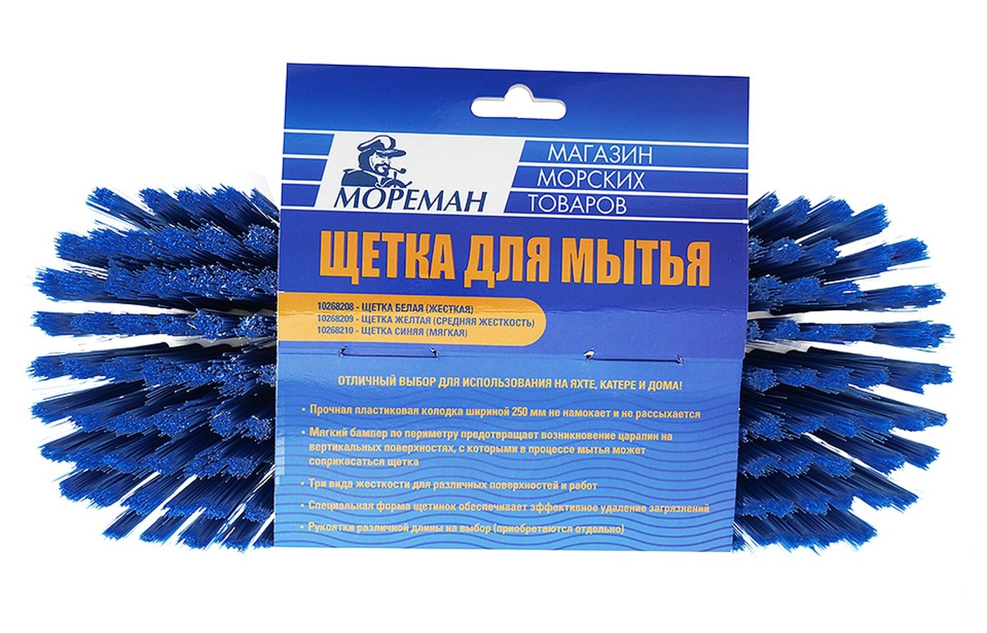 Щетка синяя (средняя жесткость), 250 мм (10268210). Качественная щетка для уборки. Полипропиленовая колодка шириной 250 мм не намокает и не растрескивается со временем. Для предотвращения царапин при контакте щетки с вертикальными поверхностями колодка снабжена мягкой накладной по периметру. Внимание! Рукоятка в комплект не входит и приобретается отдельно. Произведено в КНР по заказу компании Мореман.