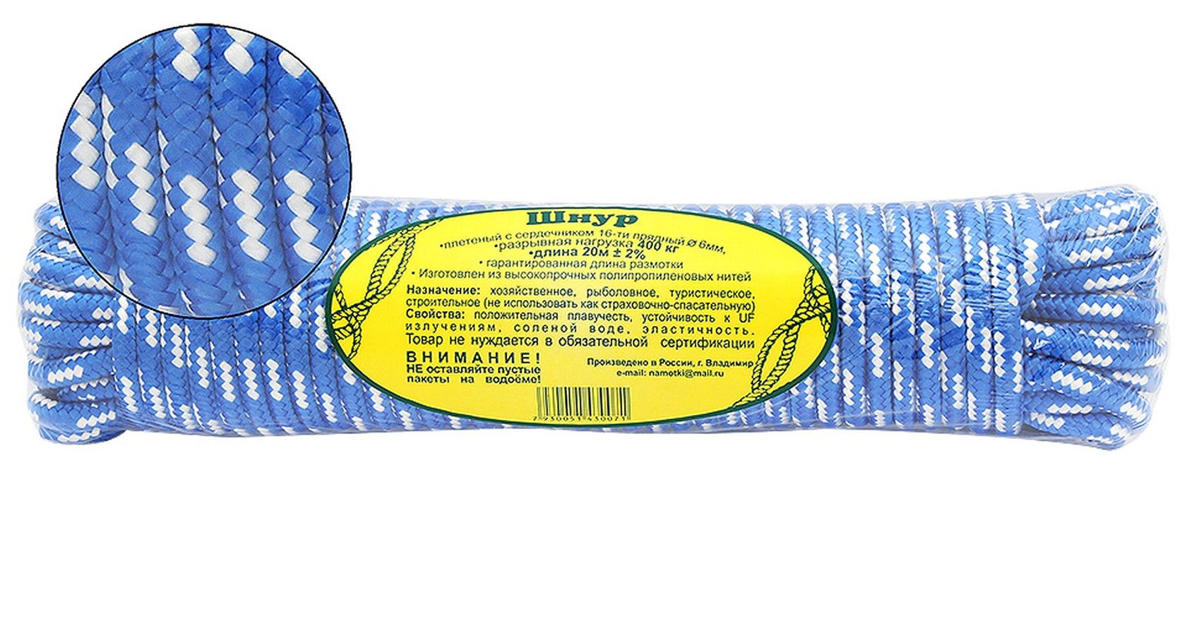 Шнур полипропиленовый плетеный 6мм*20м (10262934). Шнур из полипропиленового фала с сердечником. Устойчив к ультрафиолетовому и механическому воздействию.