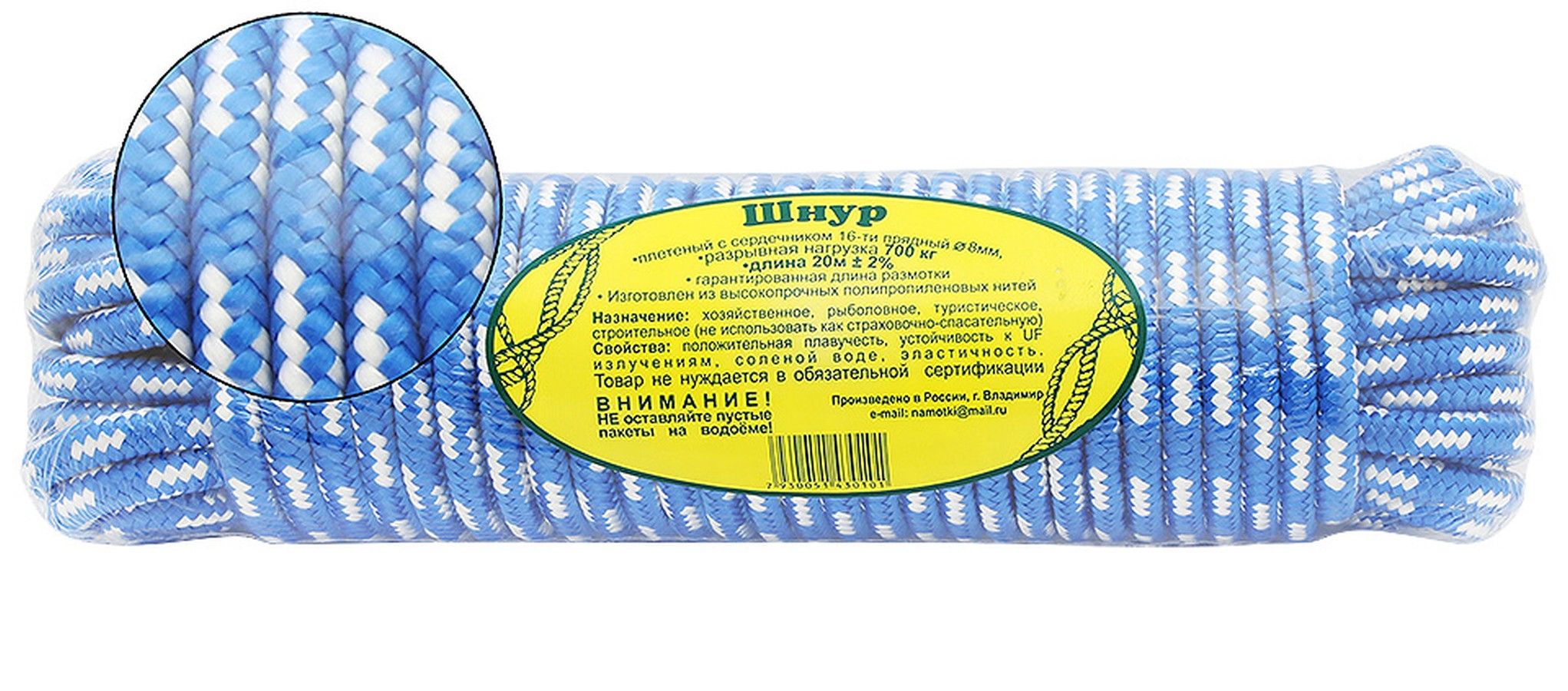 Шнур полипропиленовый плетеный 8мм*20м (10262936). Шнур из полипропиленового фала с сердечником. Устойчив к ультрафиолетовому и механическому воздействию.