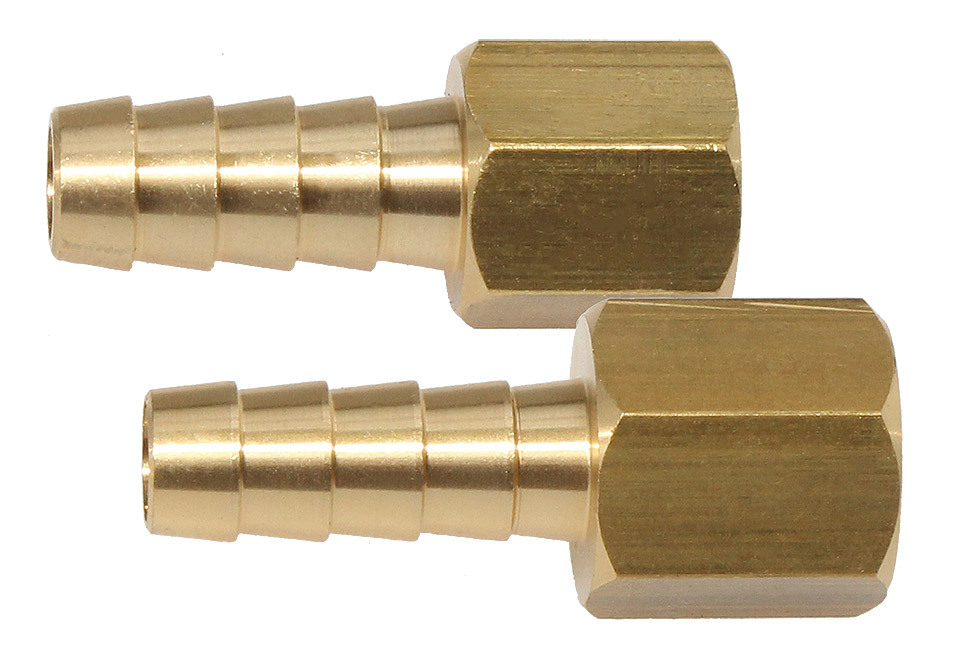 Латунный штуцер с внутренней резьбой 1/4 дюйма и патрубками под шланги с внутренним диаметром 3/8 или 5/16 дюйма (9,5 и 8 мм).