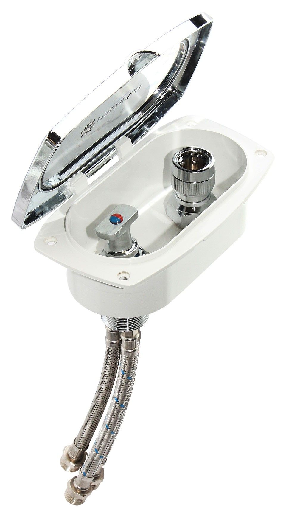 Смеситель с быстроразъемным штуцером в хромированном боксе (10260617). Компактный смеситель для холодной и горячей воды с низкопрофильной Т-образной рукояткой и гнездо под быстроразъемный штуцер (стандартный садовый штуцер) установленные в боксе из стойкого к ультрафиолету пластика (снабжен крышкой на защелке).