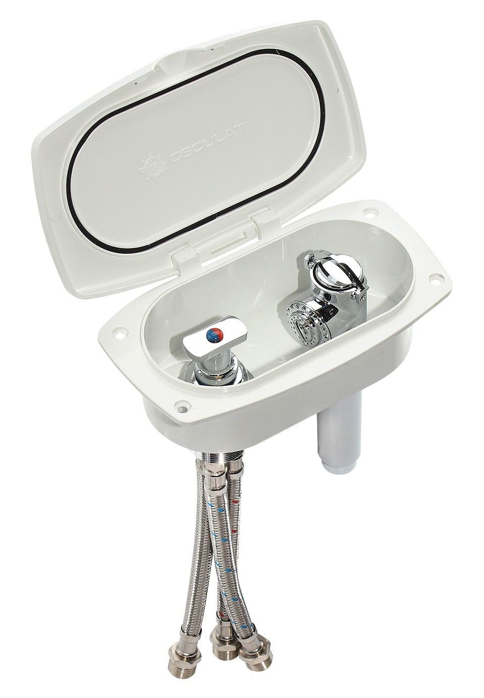 Смеситель с лейкой душа в боксе, хромированный (10261190). Компактный смеситель для холодной и горячей воды с низкопрофильной Т-образной рукояткой и лейкой душа, установленные в боксе из стойкого к ультрафиолету пластика (снабжен крышкой на защелке).