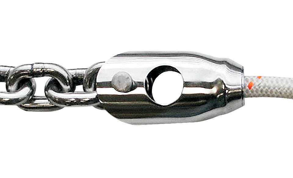 Соединительное звено, позволяющее быстро и эстетично состыковать трос и якорную цепь. Трос вставляется в отверстие звена и завязывается узлом, помещающимся внутри металлической обечайки. Цепь крепится с помощью шпильки. Данный соединитель не предназначен для работы с цепными барабанами якорных лебедок.Производитель: "Osculati", Италия.