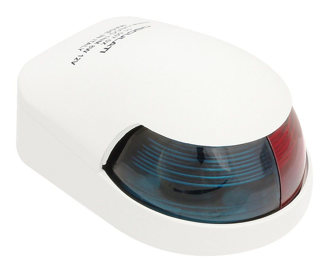 Совмещенные навигационные огни (10244740). Красный и зеленый отличительные бортовые огни, совмещенные в одном корпусе. Предназначены для установки на малые суда, конструкция которых не позволяет установить рекомендованные правилами раздельные бортовые огни. Напряжение питания: 12 В. Номинальная мощность: 8 Вт. Корпус: белый пластик. Размеры: 80х58х38 мм. Производитель: "Osculati", Италия.
