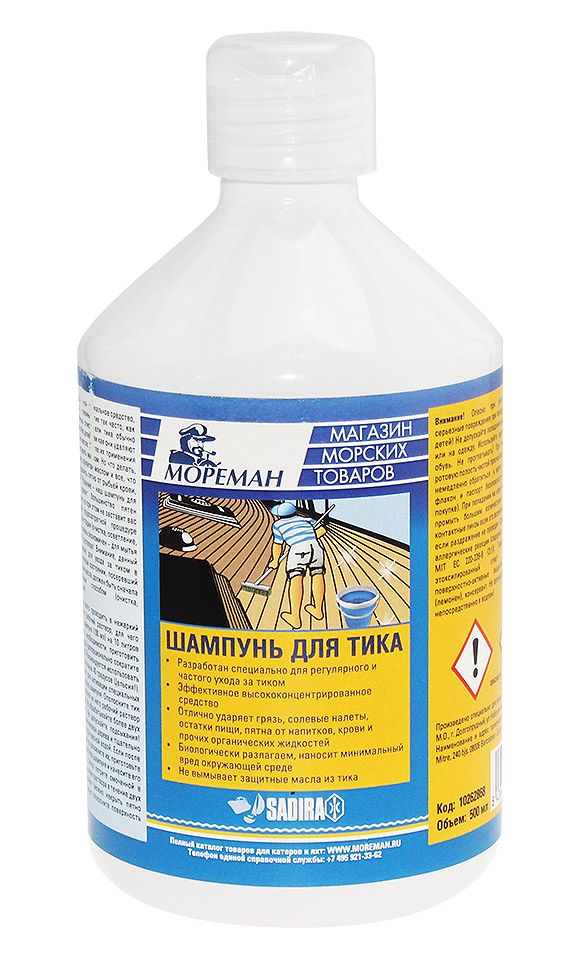 Шампунь для тика (10262868). Биоактивируемый шампунь для тика – уникальное средство, которое позволяет очищать ухоженный тик так часто, как это требуется! Традиционные очистители тика обычно чрезмерно эффективны для этих целей, так как они удаляют вместе с грязью и защитные масла. После их применения тик приходится вновь пропитывать маслом. Но что делать, если ваш тик хорошо ухожен, пропитан маслом и все, что вам нужно, это, например, удалить пятно от рыбьей крови, оставшейся после рыбалки? Решение – наш шампунь для тика! Благодаря наличию в составе шампуня энзимов, он эффективно удалит большинство пятен органического происхождения, но при этом не заставит вас прибегать к традиционной трудозатратной процедуре очисти тика, включающей три стадии (очистка, осветление, пропитка маслом)! Шампунь очень экономичен – для мытья достаточно его 1% водного раствора! Внимание, данный шампунь предназначен именно для ухода за тиком в хорошем состоянии! Тик в плохом состоянии, посеревший тик, тик, потерявший защитные масла, должен быть сначала восстановлен традиционным способом (очистка, осветление, пропитка маслом)! Объем: 500 мл. Производитель: "Sadira", Испания (специально для компании "Мореман").