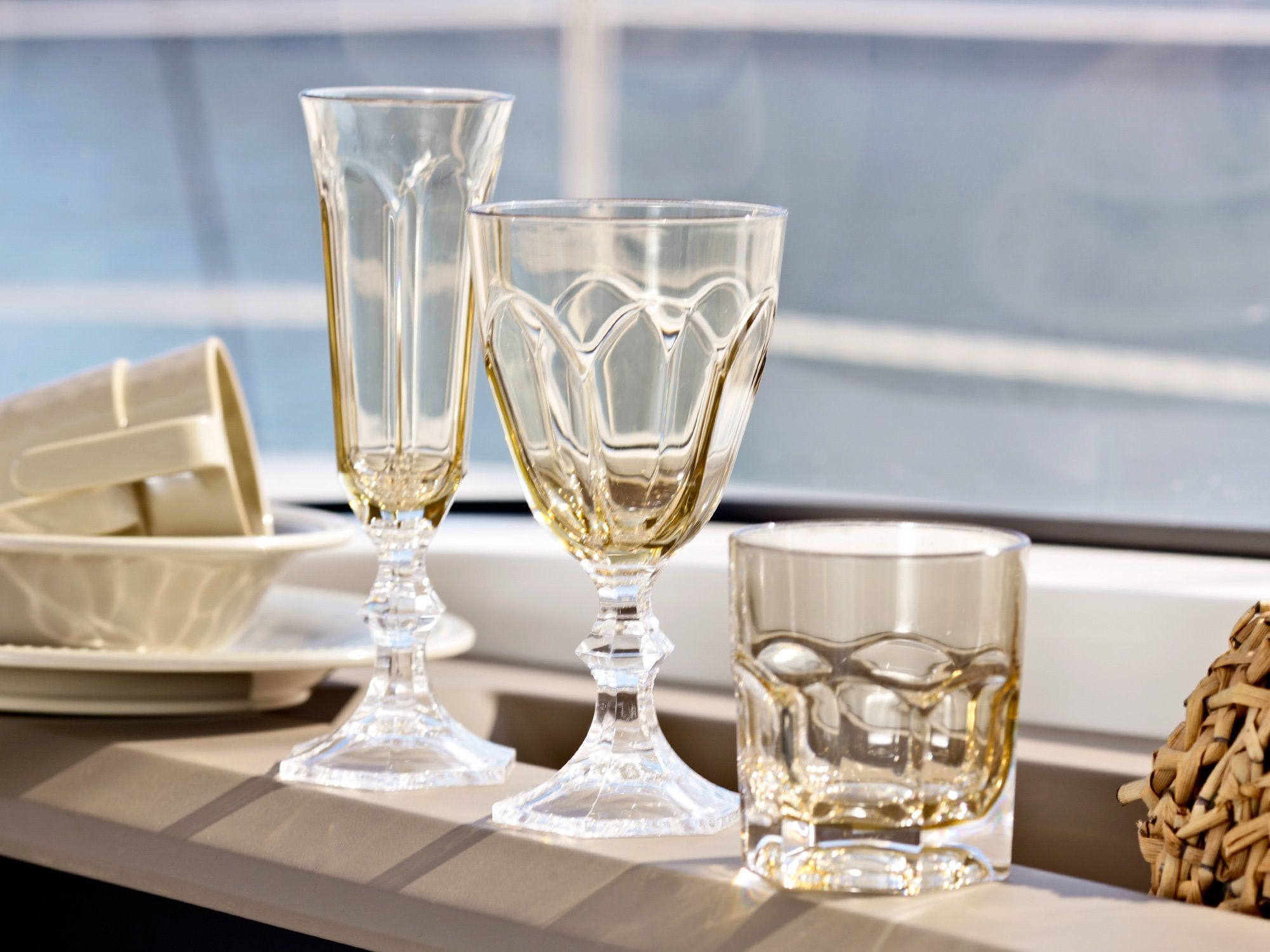 Стаканы из дымчатого стойкого к ударам метилстиренового стекла. В наборе 6 шт, цена за набор.Диаметр: 8,5 см.Высота: 9,6 см.