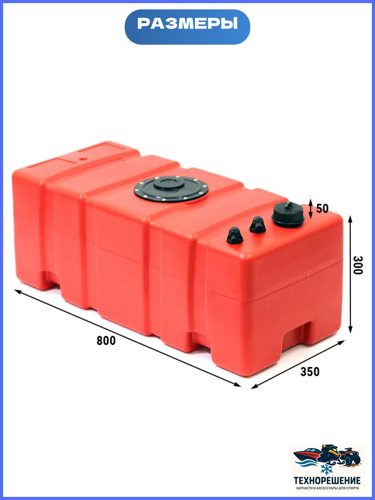 Заливная горловина с резьбовой крышкой. Два патрубка под шланги отбора топлива и вентиляции. Предусмотрена возможность установки датчика уровня топлива (приобретается отдельно). Длина: 80 см. Ширина: 35 см. Высота: 30 см. (+50 мм. высота крышки)Объем: 75 л. Материал: пластик. Производитель: "Ceredi", Италия.