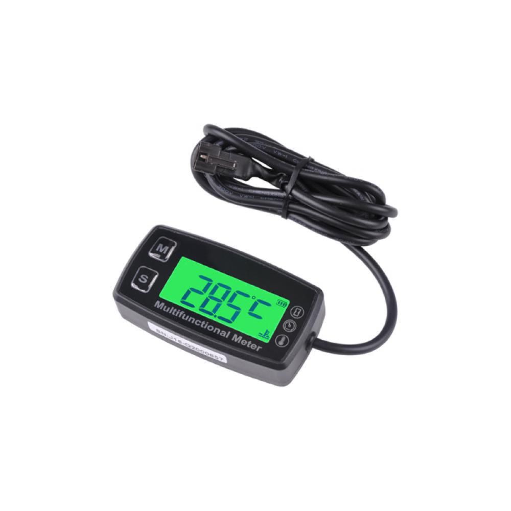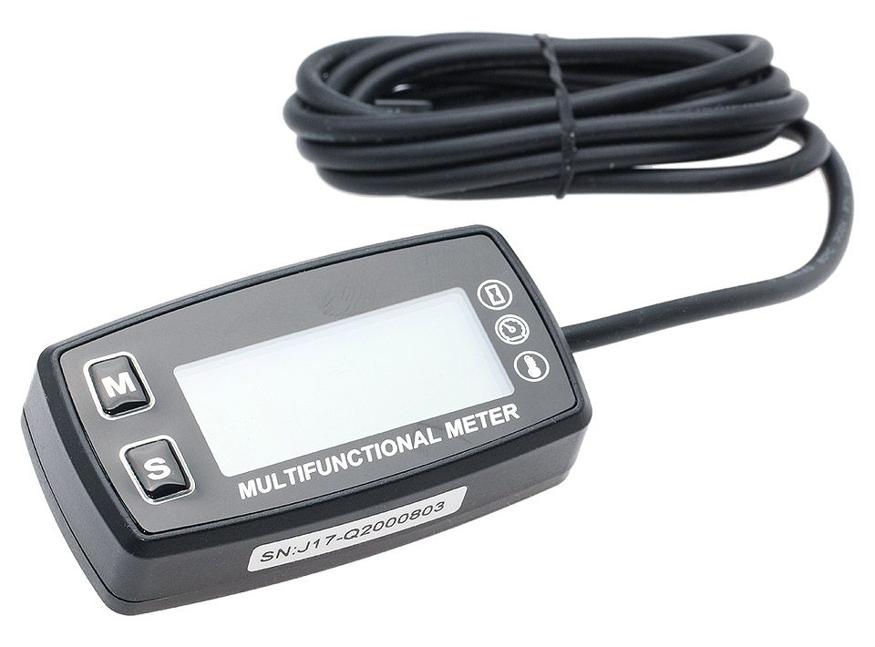 Тахометр со счетчиком моточасов и термометром (10261614). Универсальный тахометр, использующий в качестве источника сигнала провод свечи зажигания. Может использоваться с любыми бензиновыми двигателями, имеющими до 8 импульсов зажигания за один оборот коленвала. Не требует внешнего питания. Имеет возможность замены элемента питания. Индикация: обороты текущие, максимальные обороты в последнем цикле использования, предупреждение о превышении установленного пользователем предела максимальных оборотов, моточасы, 2 независимых индивидуально настраиваемых таймера периодов обслуживания (к примеру, смены масла), температура текущая, температура максимальная (возможность пользовательской установки максимальной температуры, при достижении которой на дисплее прибора отобразится предупреждение, а достигнутое значение температуры будет записано в память прибора).