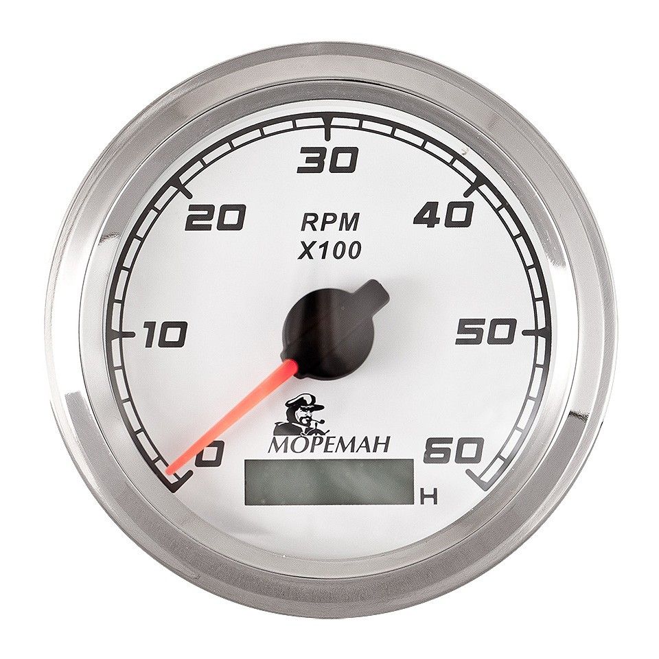 Тахометр со счетчиком моточасов, "Мореман" 6000 об/мин, белый циферблат (10252268). Стойкое к царапинам стекло. Стрелка с силиконовым демпфером, гасящим вибрацию и предотвращающим дрожание. Экранированная конструкция для защиты от электромагнитных помех. Ж/К дисплей счетчика моточасов. Белый или черный циферблат.