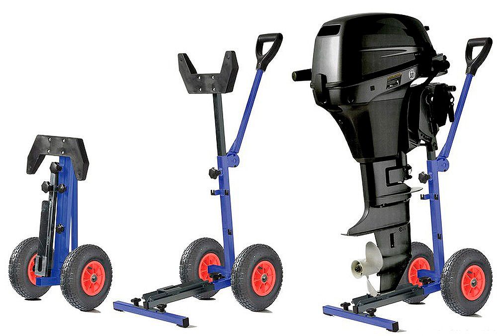 Тележка для подвесного мотора, складная (10263981). Складная тележка для перевозки и хранения подвесного мотора весом до 60 кг. Большие колеса облегчают перемещение тележки по неровной поверхности, песку, гальке. Очень компактно складывается, занимая минимум места при хранении.