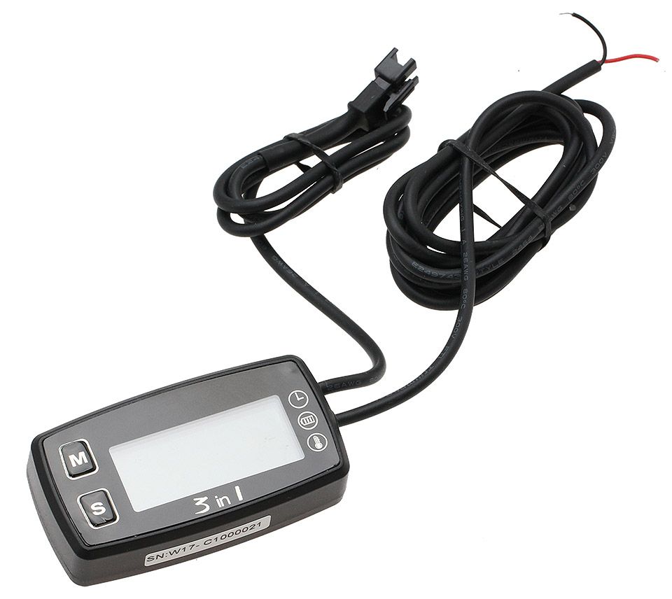 Термометр с вольтметром и часами (10261613). Компактный цифровой термометр с функцией вольтметра и часов. Возможность пользовательской установки максимальной температуры, при достижении которой на дисплее прибора отобразится предупреждение, а достигнутое значение температуры будет записано в память прибора. Возможность пользовательской установки значений повышенного или пониженного напряжения, при достижении которых на дисплее прибора отобразится предупреждение. Регулируемое время включения подсветки. Кабель питания длиной 1,1 м. Кабель датчика температуры длиной 1,1 м (при необходимости можно удлинить, используя 4-метровый удлинитель № 10261616). Простое и эффективное решение для контроля за температурой двигателей и иного оборудования.
