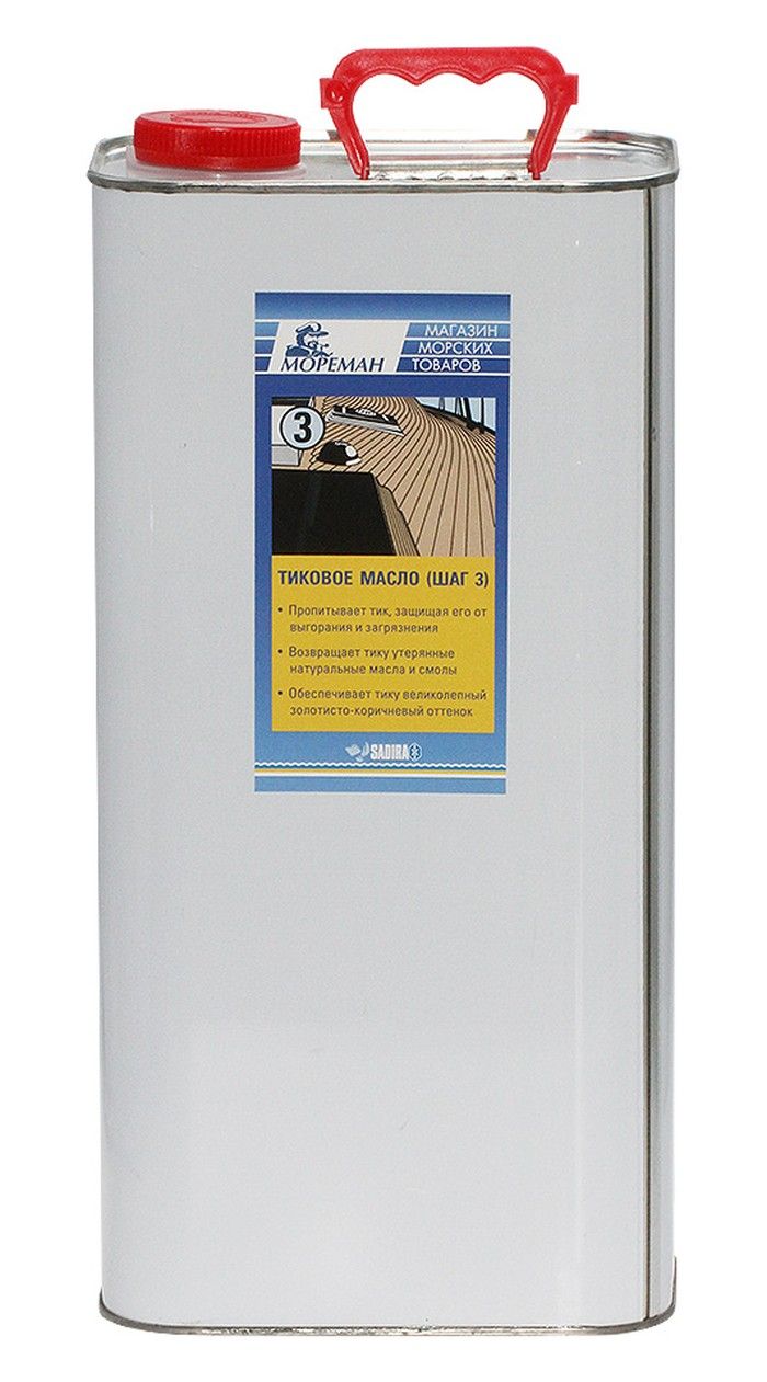 Тиковое масло (Шаг 3), "Мореман" 5000 мл (10258818). Классическое тиковое масло на базе натуральных природных компонентов. Пропитывает дерево, защищая его от выгорания и загрязнения. Возвращает тику утерянные натуральные масла. Обеспечивает тику великолепный золотисто-коричневый оттенок и защищает его от дальнейшего выгорания и загрязнения. Перед нанесением масла дерево рекомендуется обработать очистителем (10258223 или 10258220) и осветлителем (10258221,10258222). Биоразлагаемо, изготовлено из натуральных компонентов. С успехом используется также для защиты садовой медели, терасс, деревянных конструкций бассейнов в т.д.