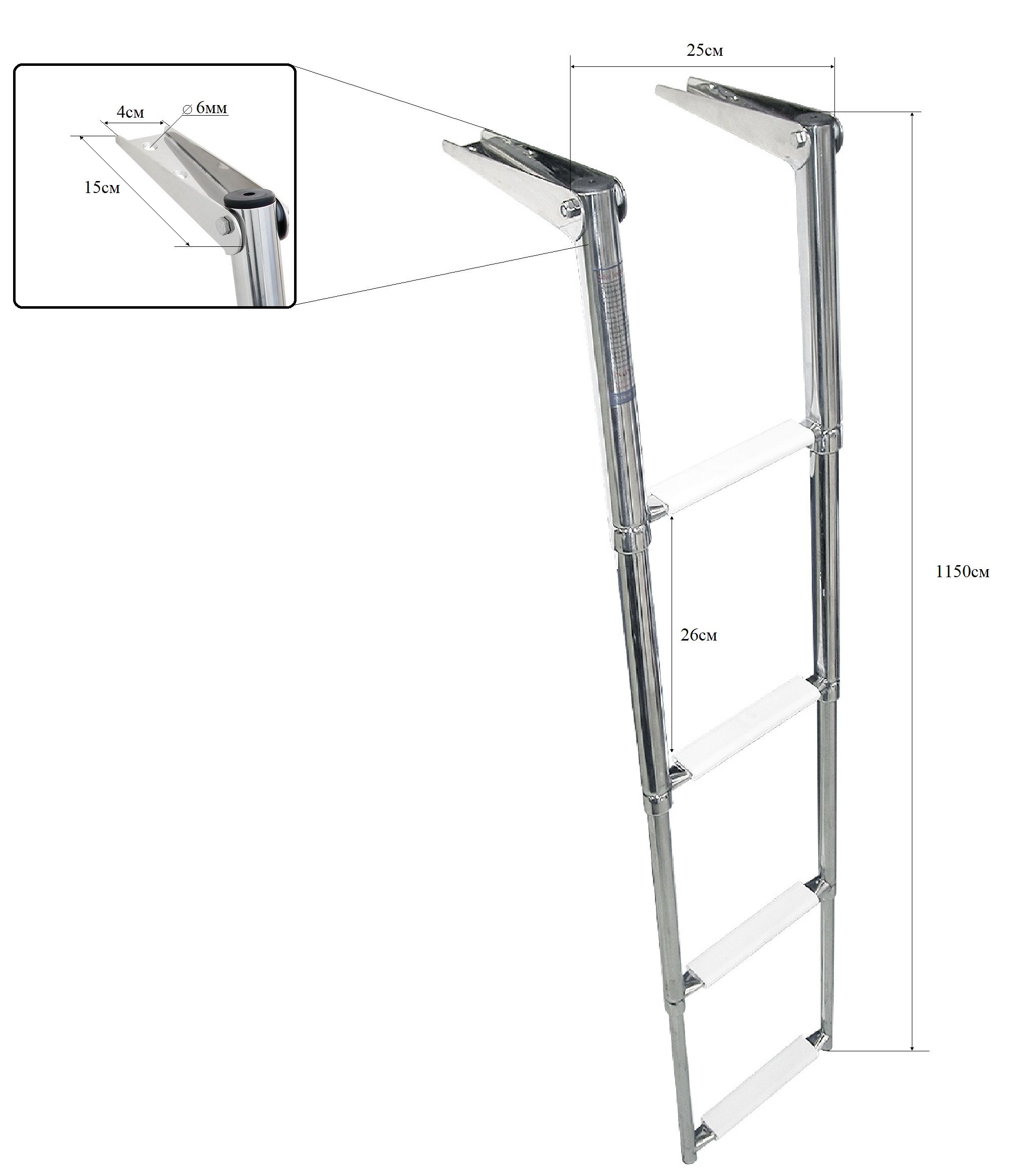 Трап телескопический, 4 ступени (10267762). Телескопический трап. Изготовлен из качественной нержавеющей стали. Ступени имеют нескользящие накладки из белого пластика.Ширина: 25 см.Длина в сложенном виде: 370/400 см (3/4 ступени).Длина в разложенном виде: 880/1150 см (3/4 ступени).Страна-производитель: Китай.