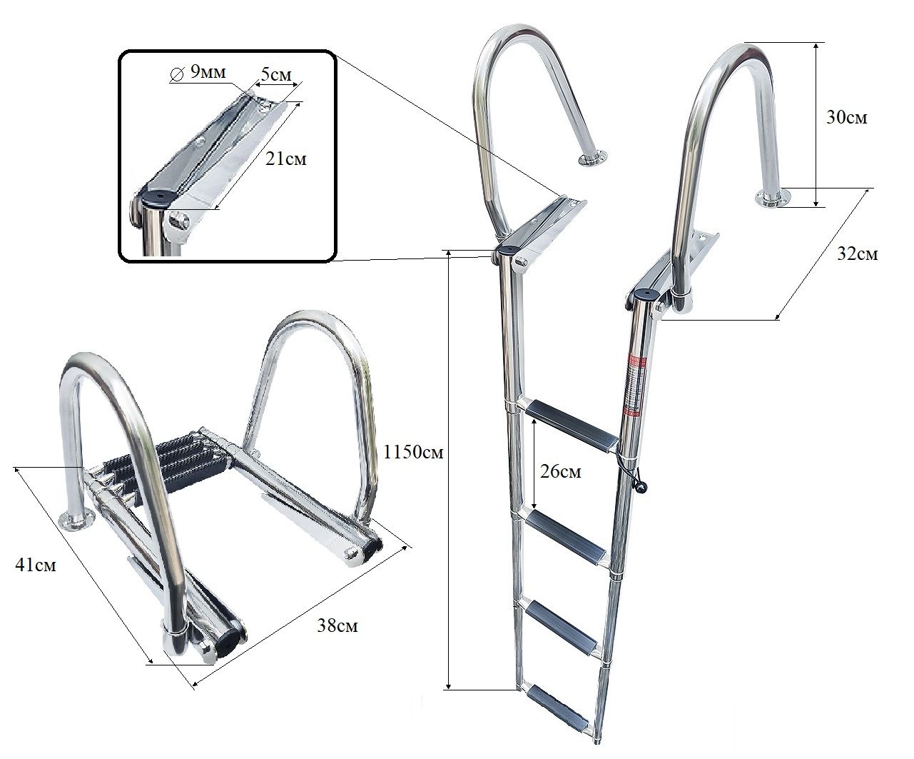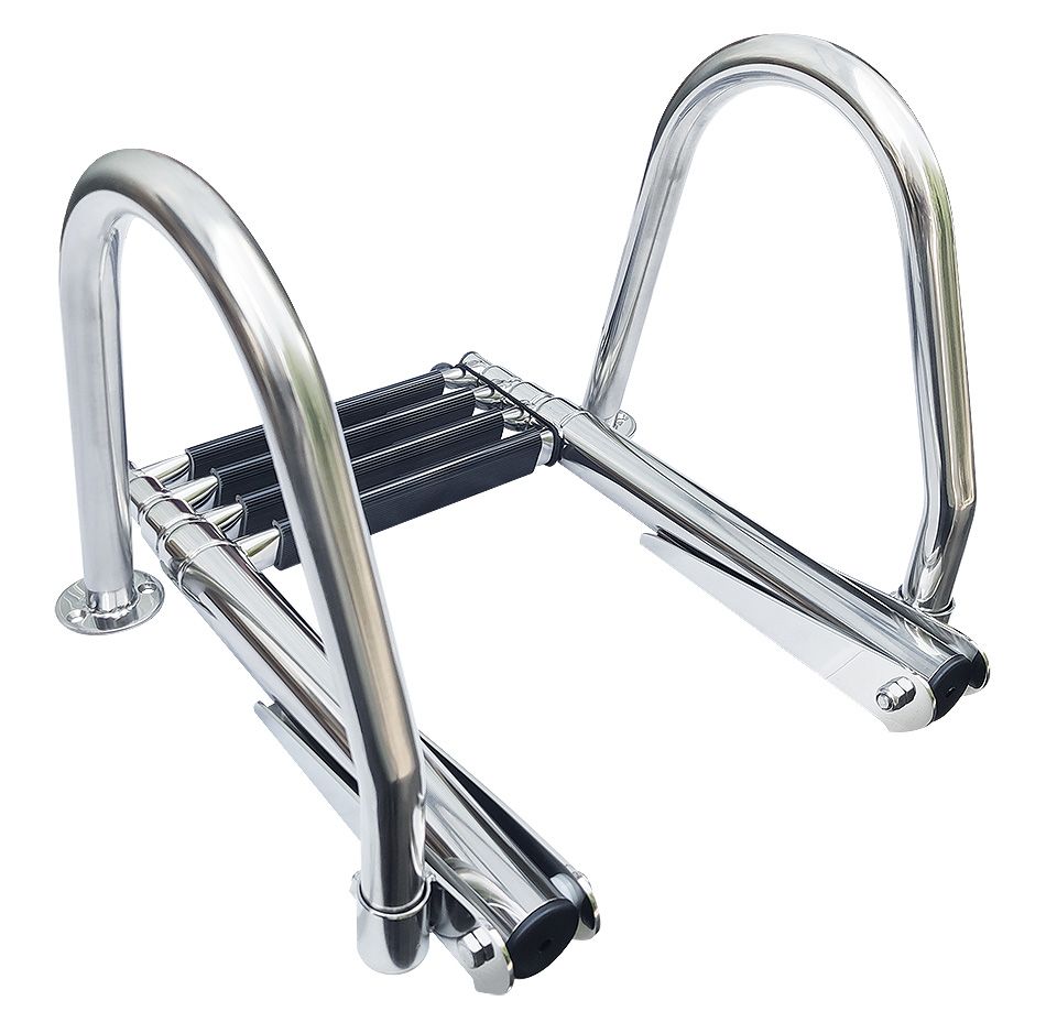 Трап телескопический с поручнями, 4 ступени (10267760). Телескопический трап с поручнями для удобства подъема и спуска. Нержавеющая сталь. 3 или 4 ступени.Ширина трапа: 300ммДиаметр поручня: 25ммСтрана-производитель: Китай.