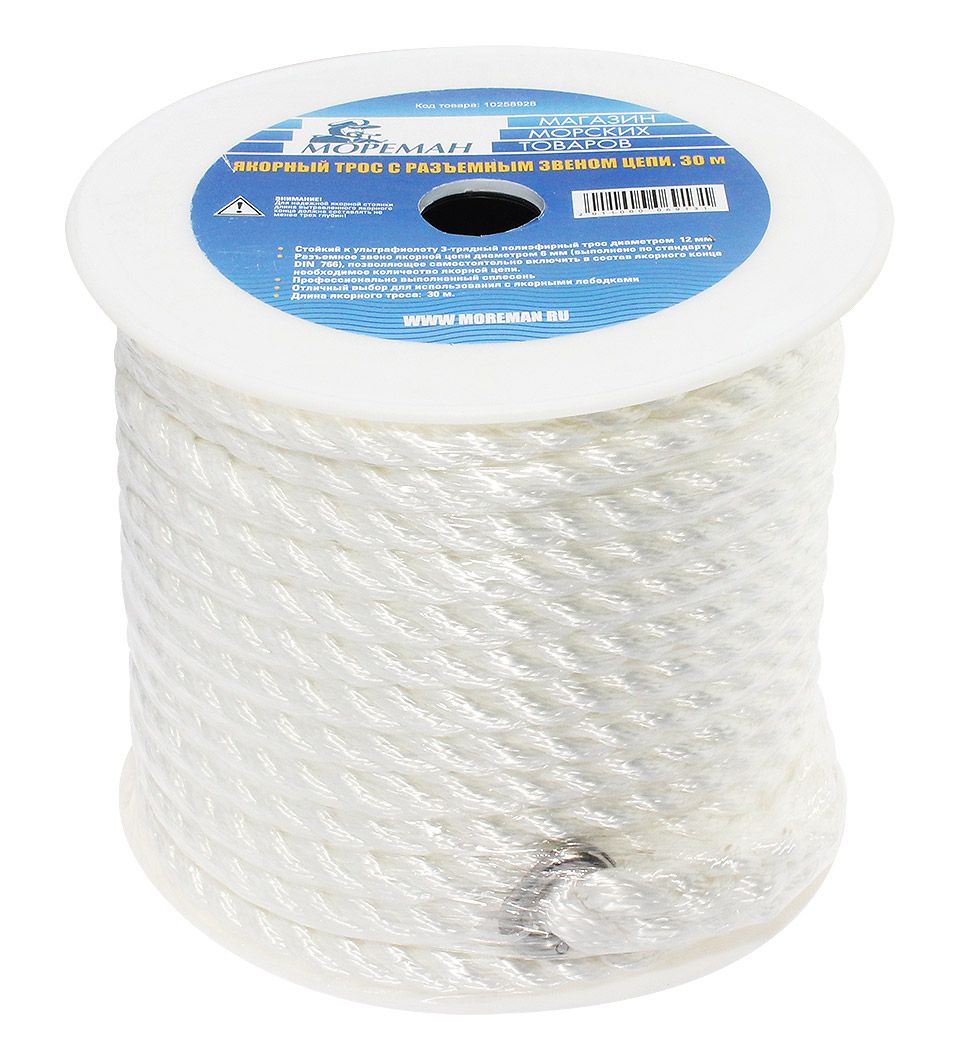 Трос трехпрядный якорный, 30 м троса + разъемное звено цепи (10263055). Трехпрядный трос 2ух видов: с вплетенным разъемным звеном якорной цепи (6 мм, DIN 766) или 5-метровым куском якорной цепи (6 мм, DIN 766). Трос - полиэфир. Цепь - оцинкованная сталь. Отличный выбор в качестве якорного конца! Рекомендуется также для применения с комбинированными брашпилями (якорными лебедками), имеющими барабан под цепь и трос.
