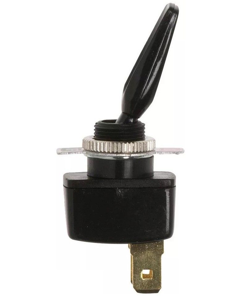 Тумблер с надписями "on/off" (10014889). Двухпозиционный ("on/off") тумблер. Напряжение питания: 12 В. Номинальный ток: 15 А. Производитель: "TMC", Тайвань.