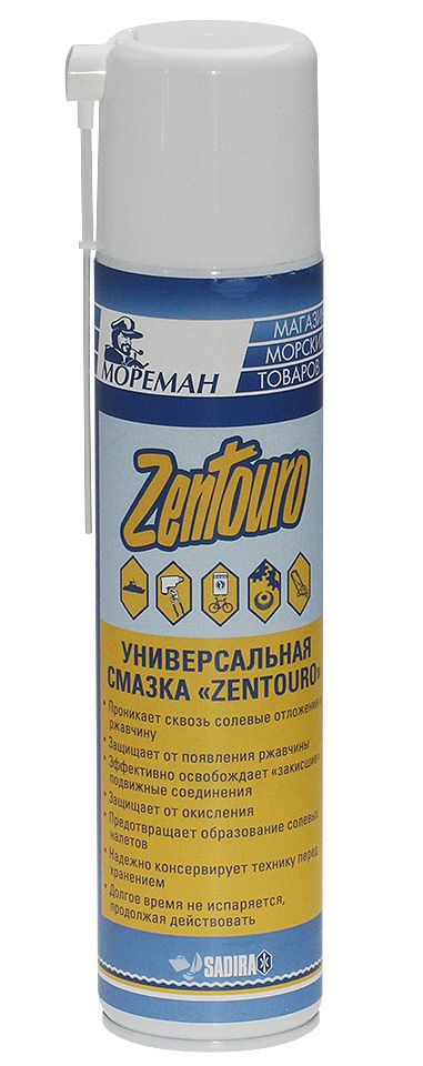 Универсальная смазка "Zentouro", 300 мл (10258226). Универсальная проникающая смазка в аэрозольном баллоне. Отлично проникает сквозь солевые отложения, окислы и ржавчину. Эффективно освобождает "закисшие" подвижные соединения (освобождает детали, потерявшие подвижность из-за ржавчины и отложения солей). Защищает от появления ржавчины и окислов. Удаляет солевые налеты и предотвращает их рост. Растворяет загустевшую смазку, очищает механизмы от продуктов окисления и солей. Надежно консервирует технику перед хранением (также используется для консервации цилиндров двигателей перед зимним хранением). В отличие от WD-40 и аналогичных смазок, долгое время не испаряется, продолжая действовать (благодаря чему она очень эффективна в качестве смазки, консерванта, а также средства для освобождения "закисших" соединений).