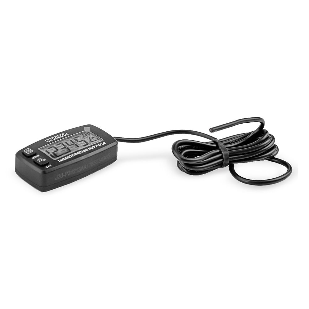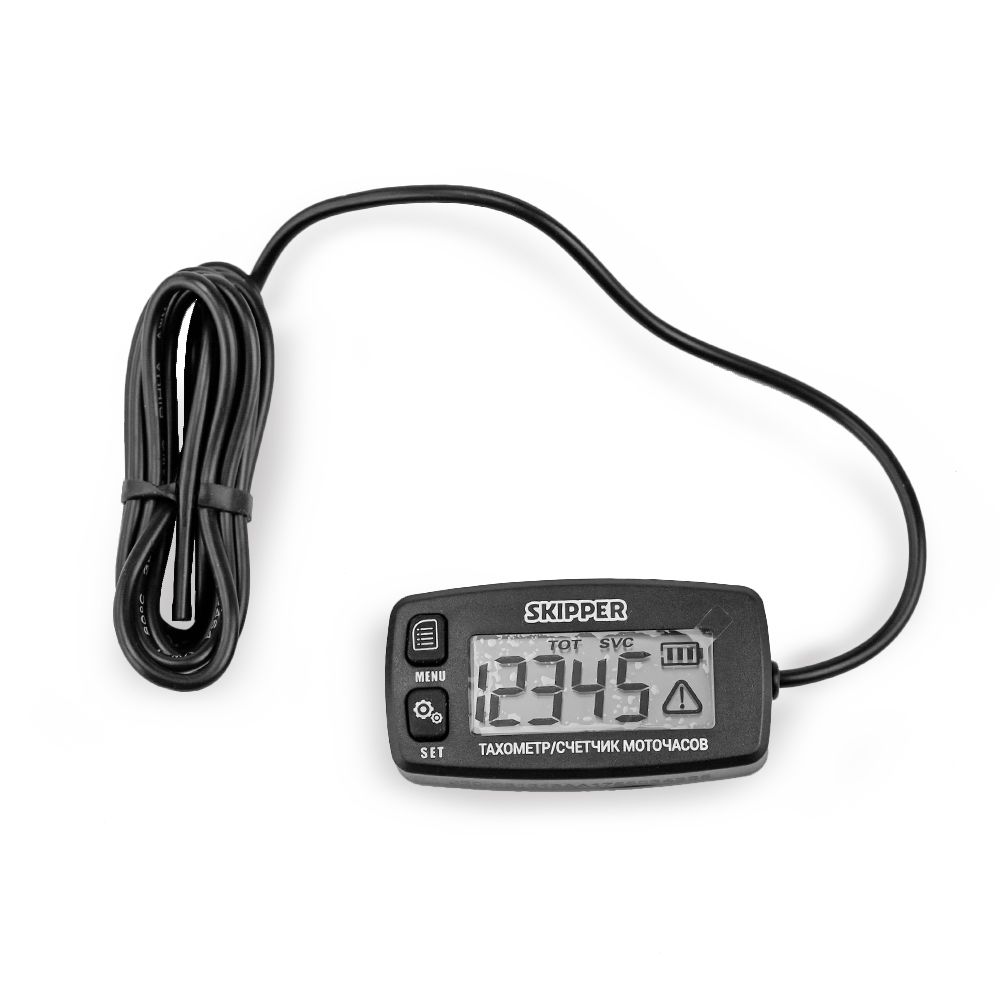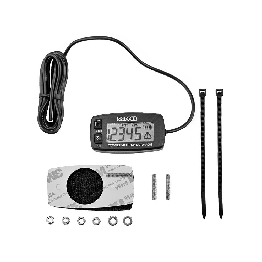 Универсальный тахометр с подсветкой дисплея и счётчиком моточасов. Предназначен для измерения числа оборотов двигателя и времени его работы. Используется только с бензиновым двигателем внутреннего сгорания. Подключается к свече зажигания двигателя, сигнальный провод наматывается вокруг свечного провода (5-6 витков). Длина сигнального провода 1.5 метра. Прибор крепится с помощью двухстороннего скотча. Класс защиты IP65 (пыленепроницаемый, брызгозащищённый).