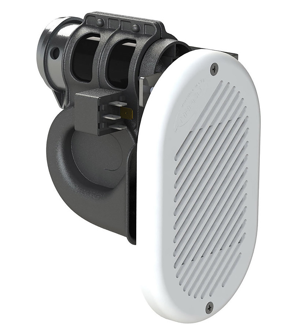 Врезной электропневматический горн "Hurricane", 24 В (10250473). Новинка! Компактный электропневматический горн скрытого монтажа. Обладает чрезвычайно громким (120 Дб! ) и сочным звуком, свойственным всем горнам с воздушными компрессорами. Изготовлен из стойких к коррозии материалов. Снабжен мембраной для защиты от влаги. Поставляется с белой внешней декоративной накладкой.