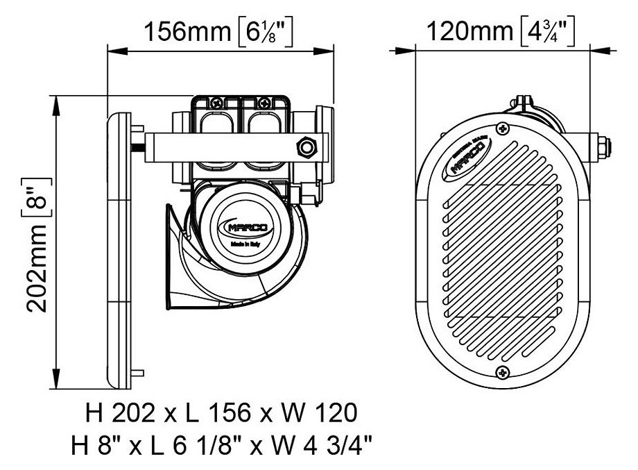 Напряжение питания: 12, 24 В. Номинальный потребляемый ток: 18 А. Громкость (на расстоянии 1 м): 120 Дб. Частота звука: 300 Гц. Размеры: 134*195*167 мм. Производитель: "Marco", Италия.