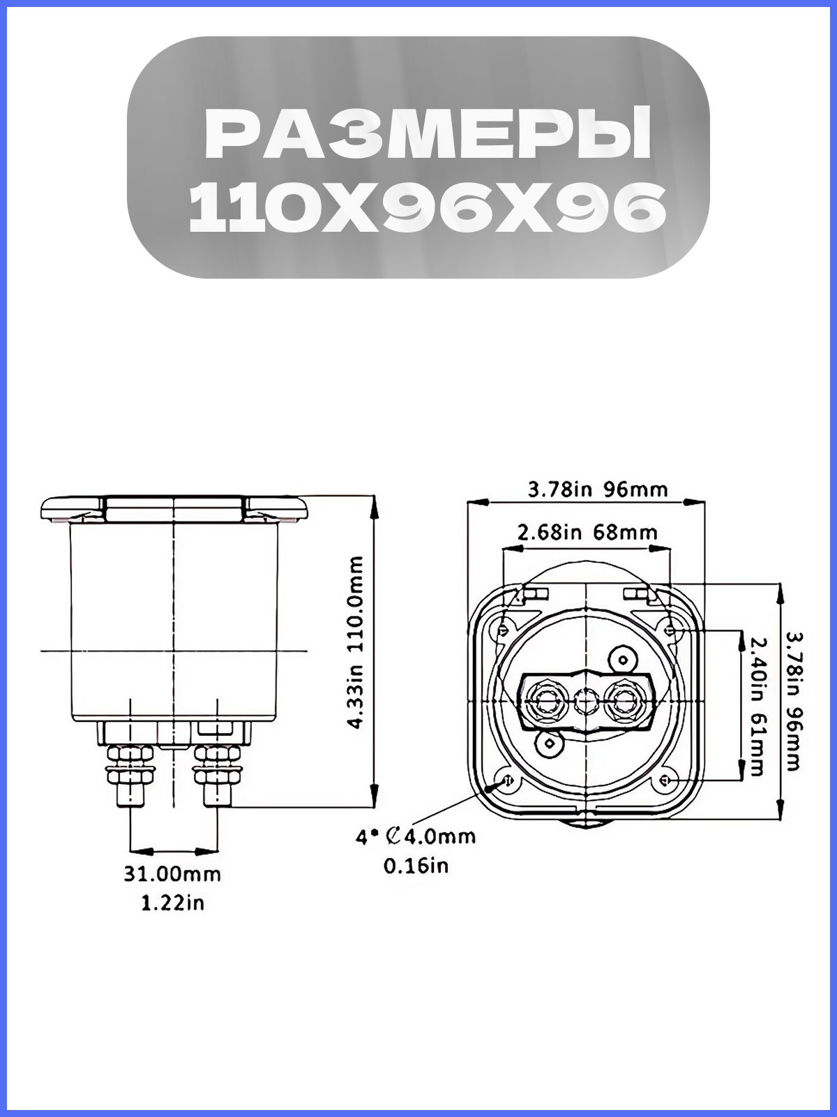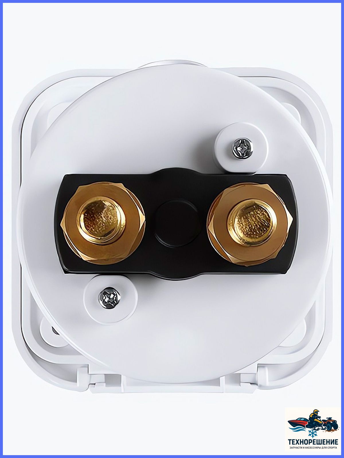 Основные параметры: • Рабочее напряжение: до 50 В • Длительная нагрузка: 275 А • Кратковременная нагрузка (5 мин): 450 А • Пусковой ток: до 1250 А • Тип: выключатель массы в водонепроницаемом боксе • Габариты: 110×96×96 мм • Материал: пластик / латунь • Масса: 0.4 кг