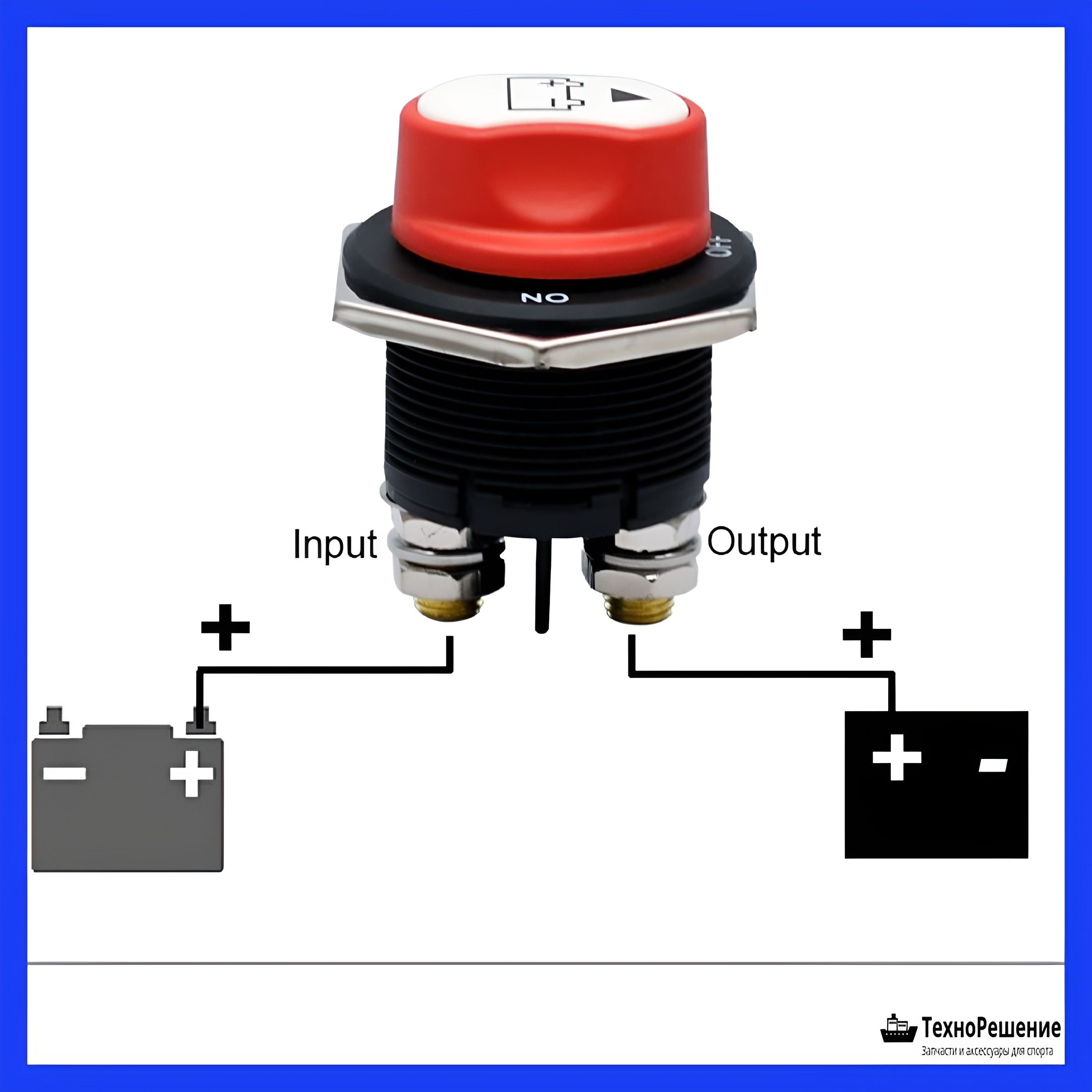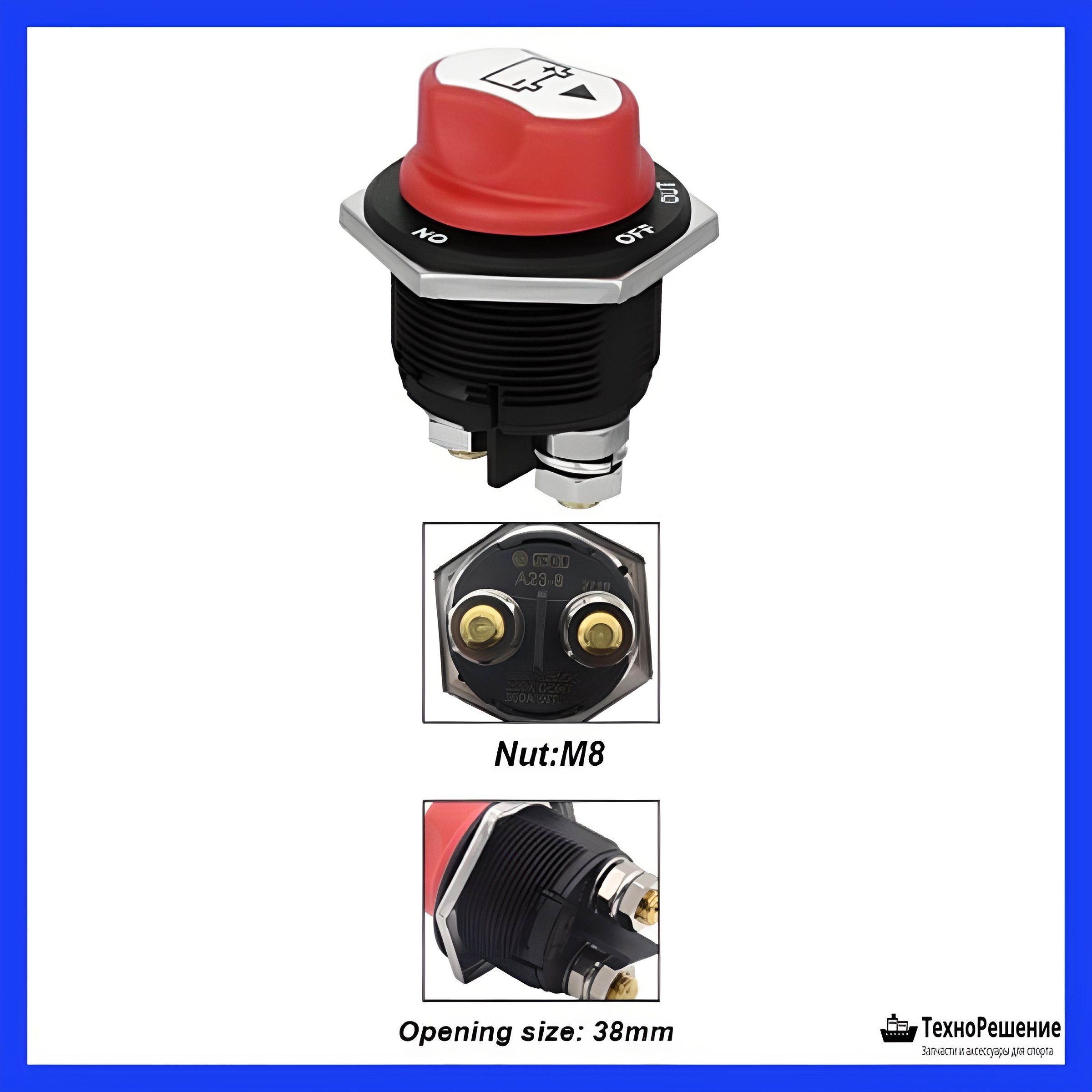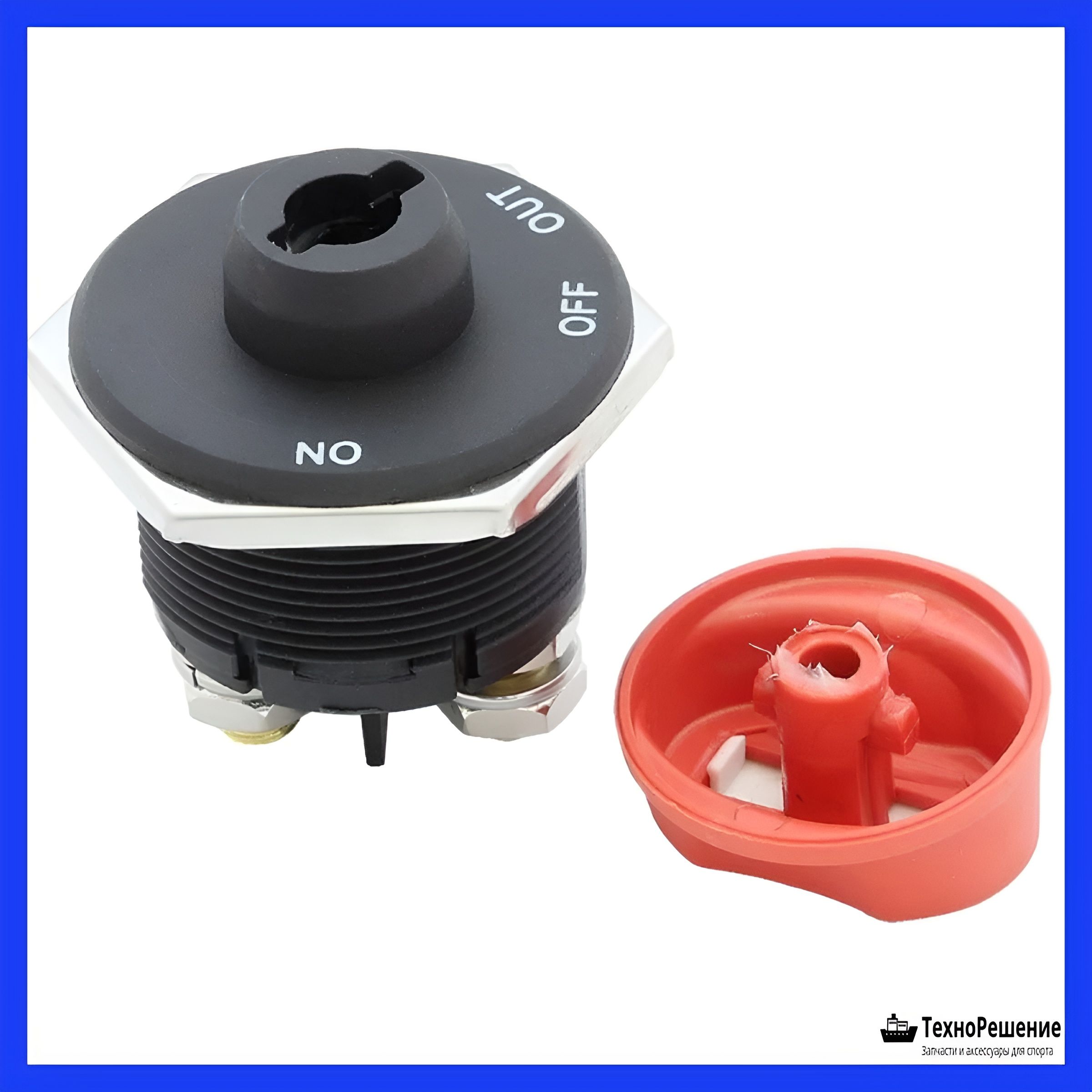 Выключатель вкл/выкл со съемной ручкой, 200/300 A. Компактный выключатель массы. Врезается в приборную панель или в переборку. Имеет съемную рукоятку, что позволяет использовать выключатель для предотвращения несанкционированного включения электропитания. Имеет три положения рукоятки: OFF (питание выключено), ON (питание включено), OUT (в этом положении рукоятку можно снять с выключателя). Максимальный ток в постоянном режиме: 200 А. Максимальный ток в кратковременном режиме: 300 А. Максимальное напряжение: 32 В. Диаметр монтажного отверстия: 38 мм. Резьба на контактах: М8. Страна-производитель: Китай.