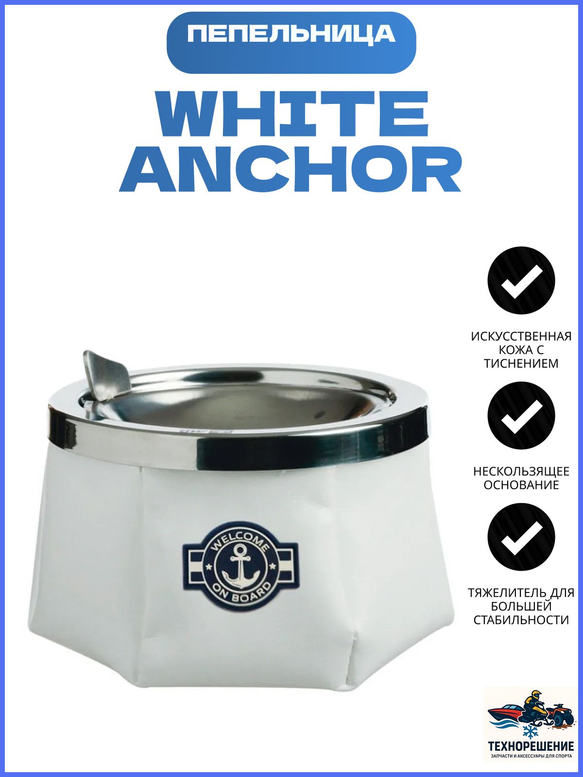 Пепельница White Anchor (10265945). Крышка и емкость для пепла из нержавеющей стали. Искусственная кожа с тиснением (замша на ряде моделей). Нескользящее основание и утяжелитель для большей стабильности.Диаметр: 115 мм. Производитель: "Marine Business", Испания.