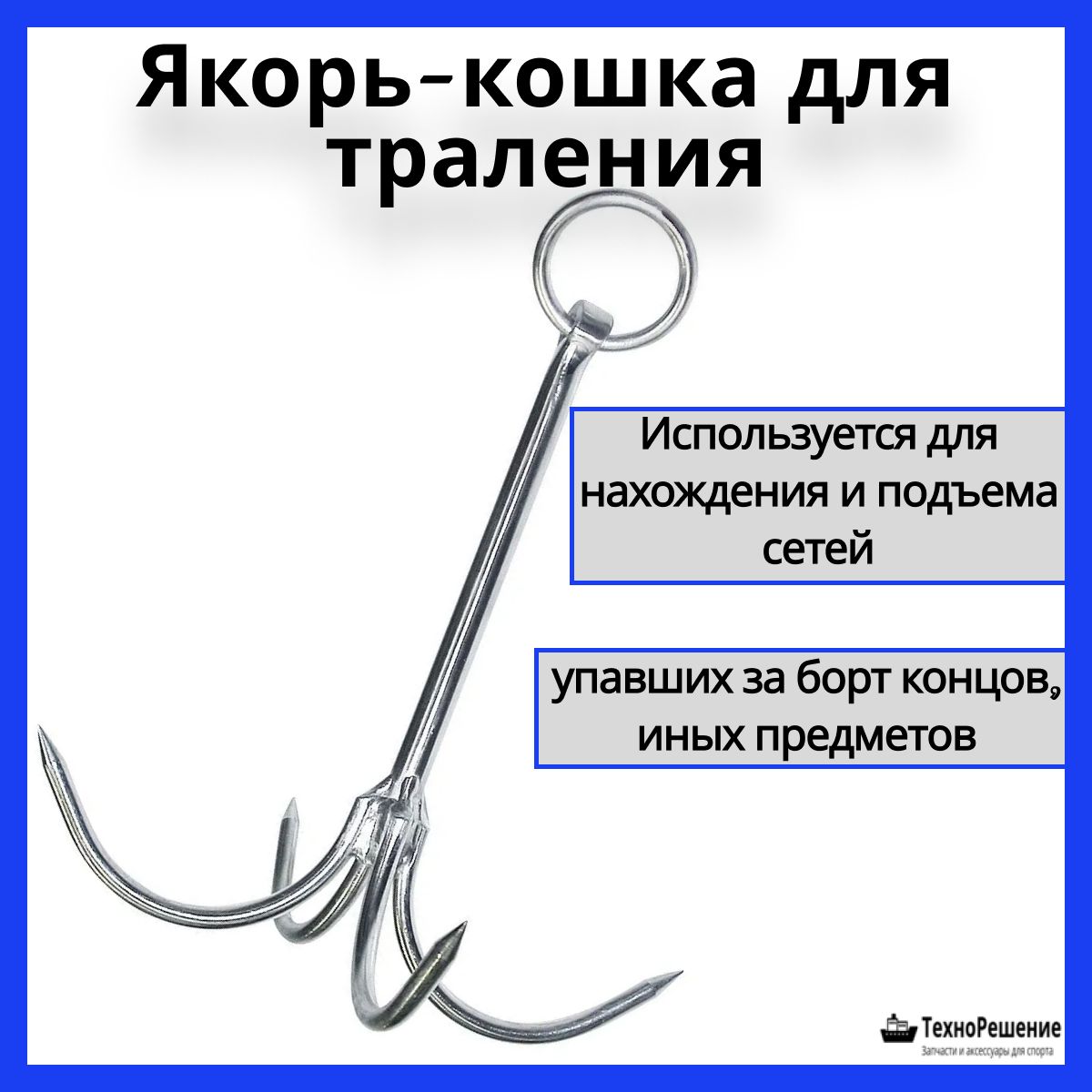 Якорь-кошка для траления. Используется для нахождения и подъема сетей, упавших за борт концов, иных предметов. Изготовлен из полированной нержавеющей стали. Размер, мм: 220*150. Производство: Китай