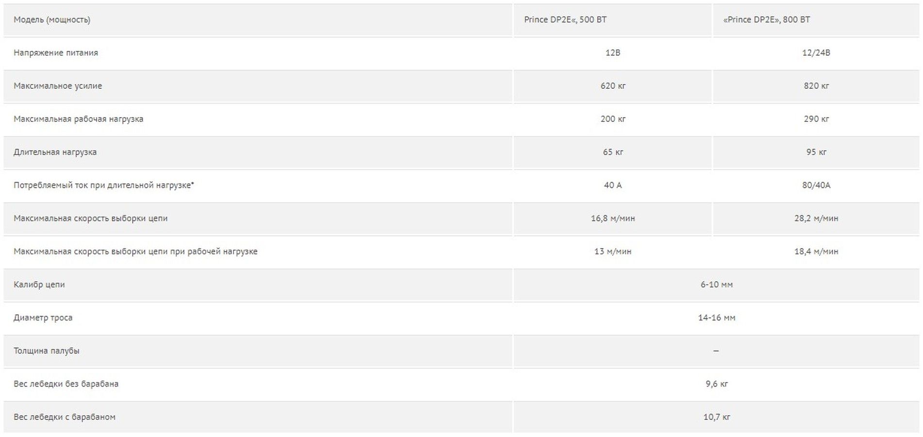 Якорная лебедка "Prince DP2E", 500 Вт, 12 В, цепь 6 мм (10252558). Якорная лебедка «Prince DP2E», мощность 500 Вт, напряжение питания 12 В, цепь 6 мм (DIN 766). Способна работать с цепью, тросом, а также комбинированным якорным концом (цепь + трос).. Имеет функцию аварийного спуска цепи (барабан освобождается с помощью входящей в комплект поставки рукоят;ки). Особенностью данной модели является наличие редуктора патентованной конструкции, имеющего высокий КПД, благодаря чему лебедки ""Prince DP2E"" обеспечивают большую тягу на каждую единицу мощности двигателя, нежели лебедки с традиционным редуктором. Благодаря вертикально рас;положенному двигателю данная лебедка может устанавливаться на палубу значительной толщи;ны. Корпус, звездочка под цепь и барабан под трос - хромирован;ная бронза. Двигатель защищен от действия воды (класс защиты IP67).