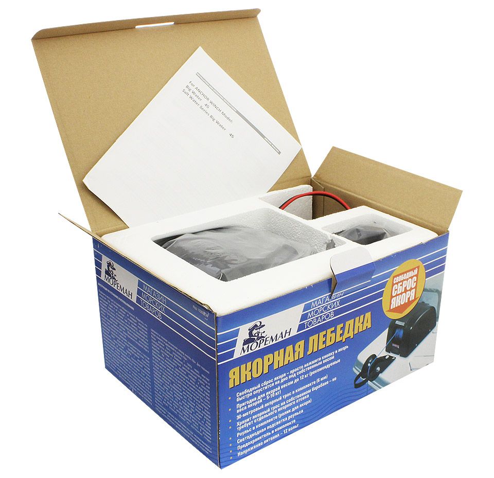 Якорная лебедка тросовая, со свободным сбросом якоря (10263422). Якорная лебедка, наматывающая трос на собственный барабан. Оснащена механизмом свободного сброса якоря - при нажатии и удержании кнопки "Down" (спуск), механизм, фиксирующий барабан с якорным тросом, разобщается, позволяя якорю погрузиться на дно под действием собственного веса, что, во-первых, ускоряет отдачу якоря, во-вторых избавляет от шума электромотора якорной лебедки, пугающего рыбу. Отличное решение для рыболовных лодок, не имеющих достаточно места под палубой для хранения цепи/троса в случае установки лебедки традиционной конструкции.