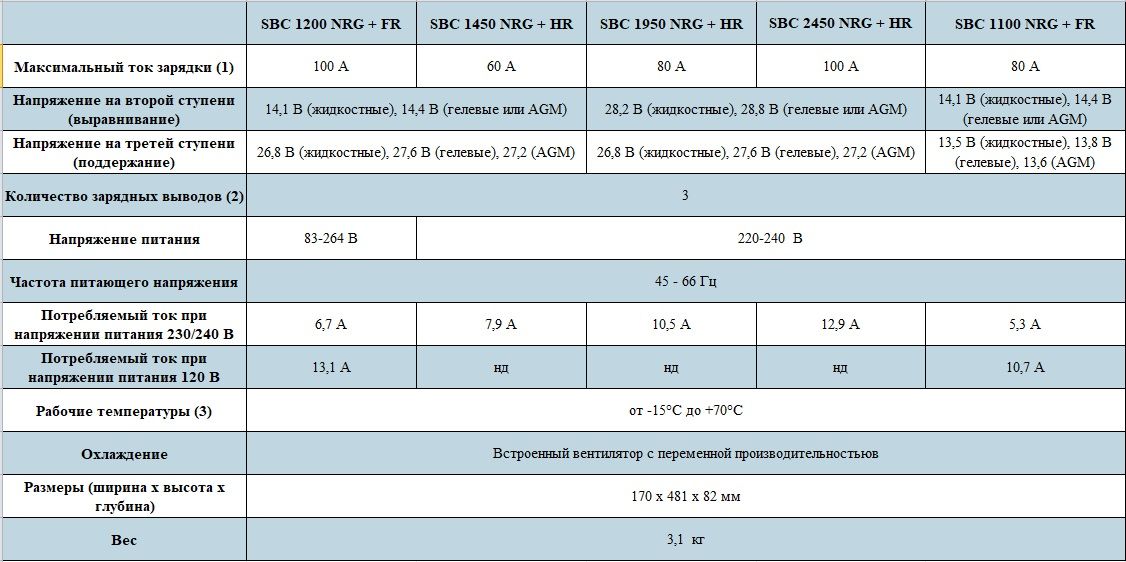 Зарядные устройства имеют все необходимые защиты (перегрев, перегрузка, переполюсовка). Все устройства данной серии имеют светодиодные индикаторы, отображающие текущие параметры работы, а также коды ошибок в случае возникновения неполадок. Все устройства допускают подключение внешних дисплеев и(или) температурных датчиков (опция). Отлично работают как от береговой сети, так и от любых автономных генераторов переменного тока. Могут использоваться в качестве источников питания постоянного тока даже без подключения аккумуляторной батареи (однако, подключение батареи настоятельно рекомендуется даже в этом случае в качестве буферной).