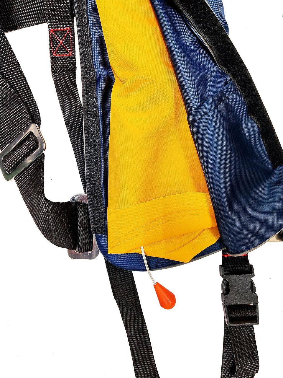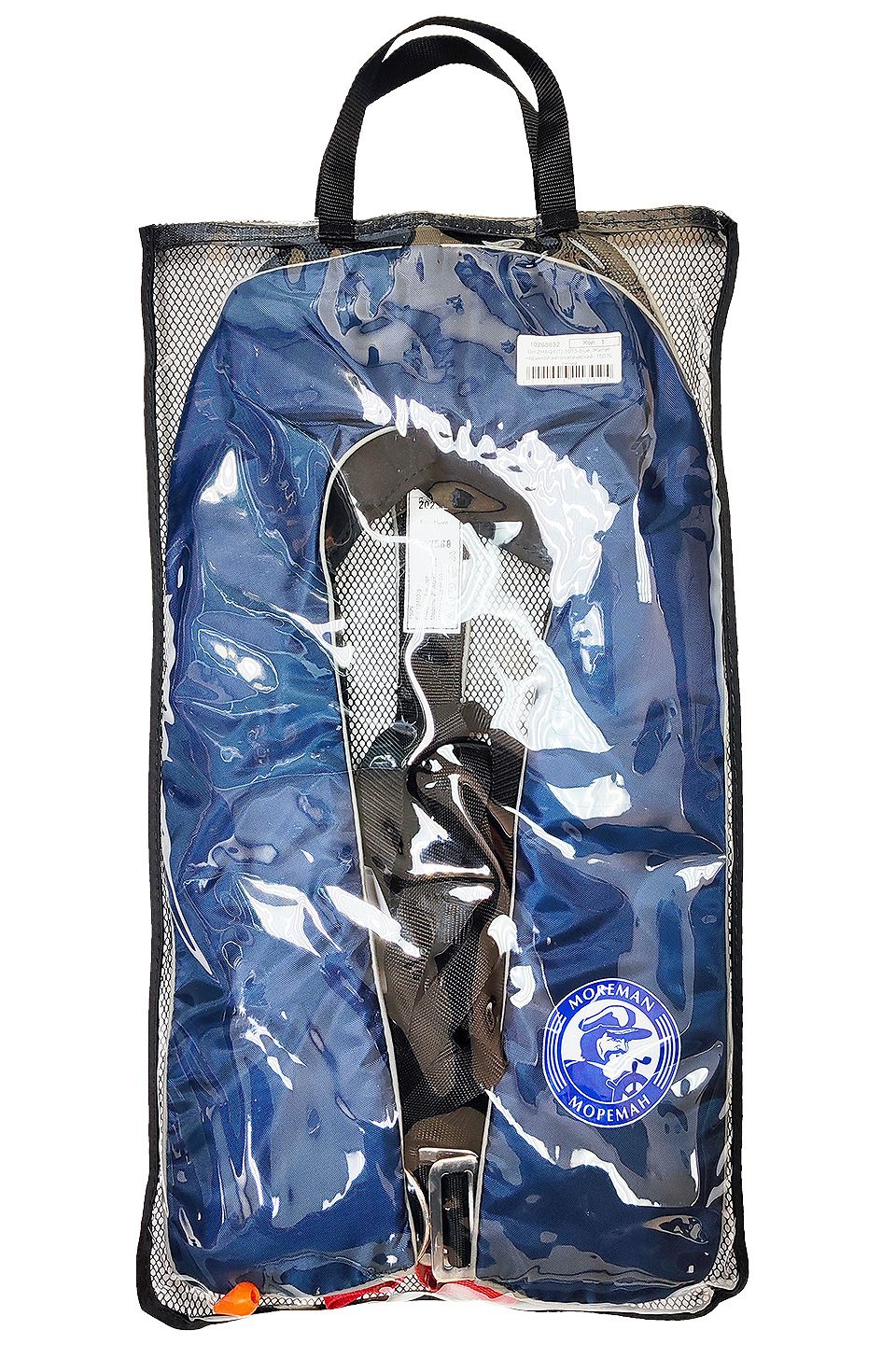 Жилет надувной автоматический "Мореман Комфорт", 150 N, синий (10268832). Надувной жилет, автоматически раскрывается и наполняется газом при попадании в воду, также может быть активирован принудительно вручную. Снабжен паховыми стропами, необходимыми для того, чтобы при попадании в воду жилет не поднимался в верхнюю часть туловища и не давил на шею. В отличие от жилетов из вспененных материалов, надувной жилет не стесняет движений и не затрудняет теплообмен тела в жаркую погоду (дополнительная особенность: прилегающая к телу часть жилета выполнена из сетчатой ткани на мягкой подкладке, что позволяет телу дышать). В отличие от дешевых жилетов типа "конвертик", более удобен для длительного ношения. Полиэстеровый чехол-подкова красного, синего и черного цветов предохраняет надувную камеру от повреждений. Нашивка "Мореман" на чехле жилета - светоотражающая. Надувная камера ярко-оранжевого цвета имеет подковообразную форму, что способствует удержанию головы человека лицом вверх, что очень важно если попавший в воду человек по каким-то причинам теряет сознание. Жилет оснащен аварийным свистком, надежной застежкой-пряжкой из нержавеющей стали, страховочным поясом с D-образным кольцом для крепления страховочного линя (не требуется приобретение отдельной страховочной обвязки!) и светоотражающими нашивками. Имеется трубка для аварийного надувания жилета ртом.